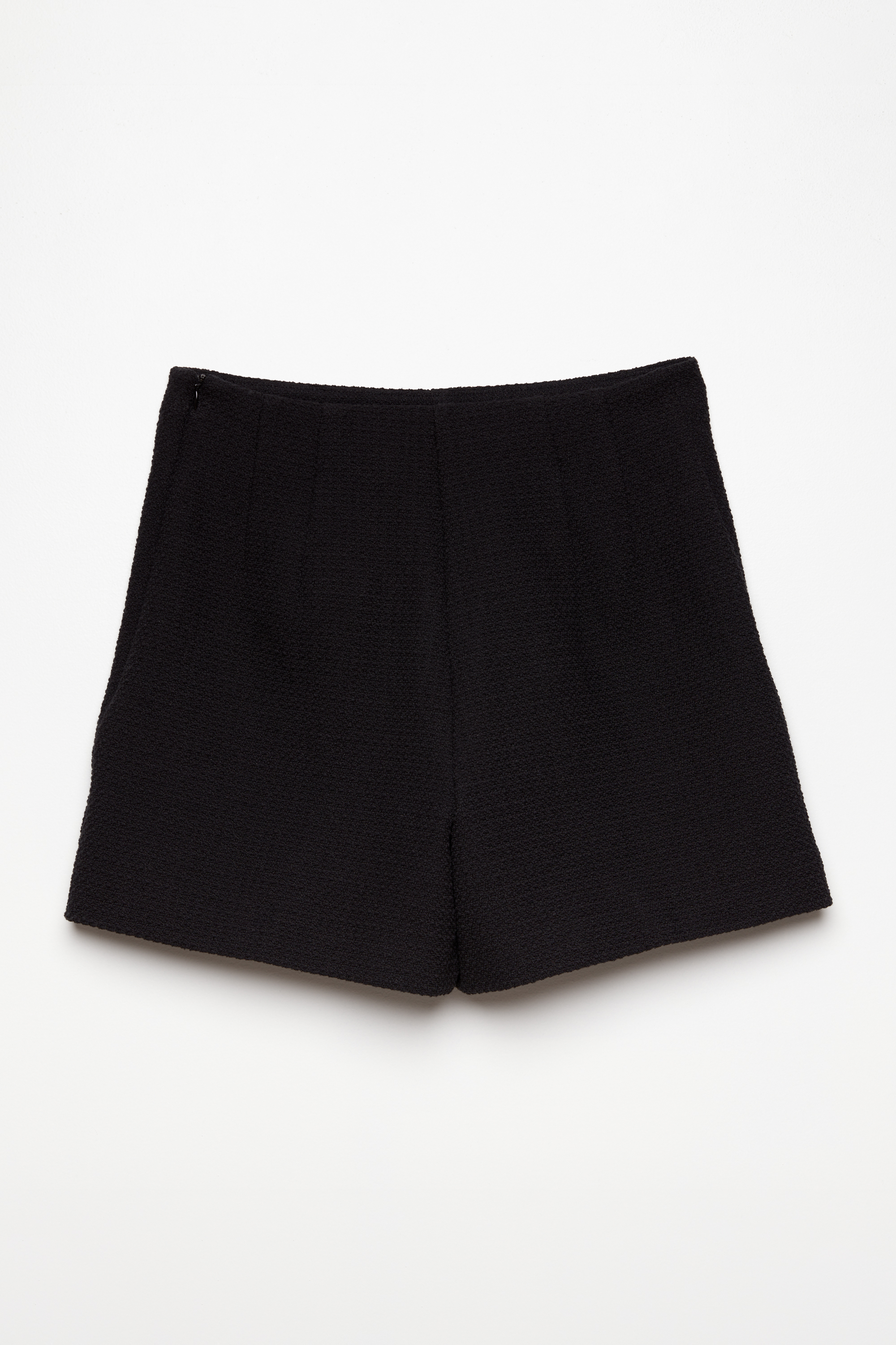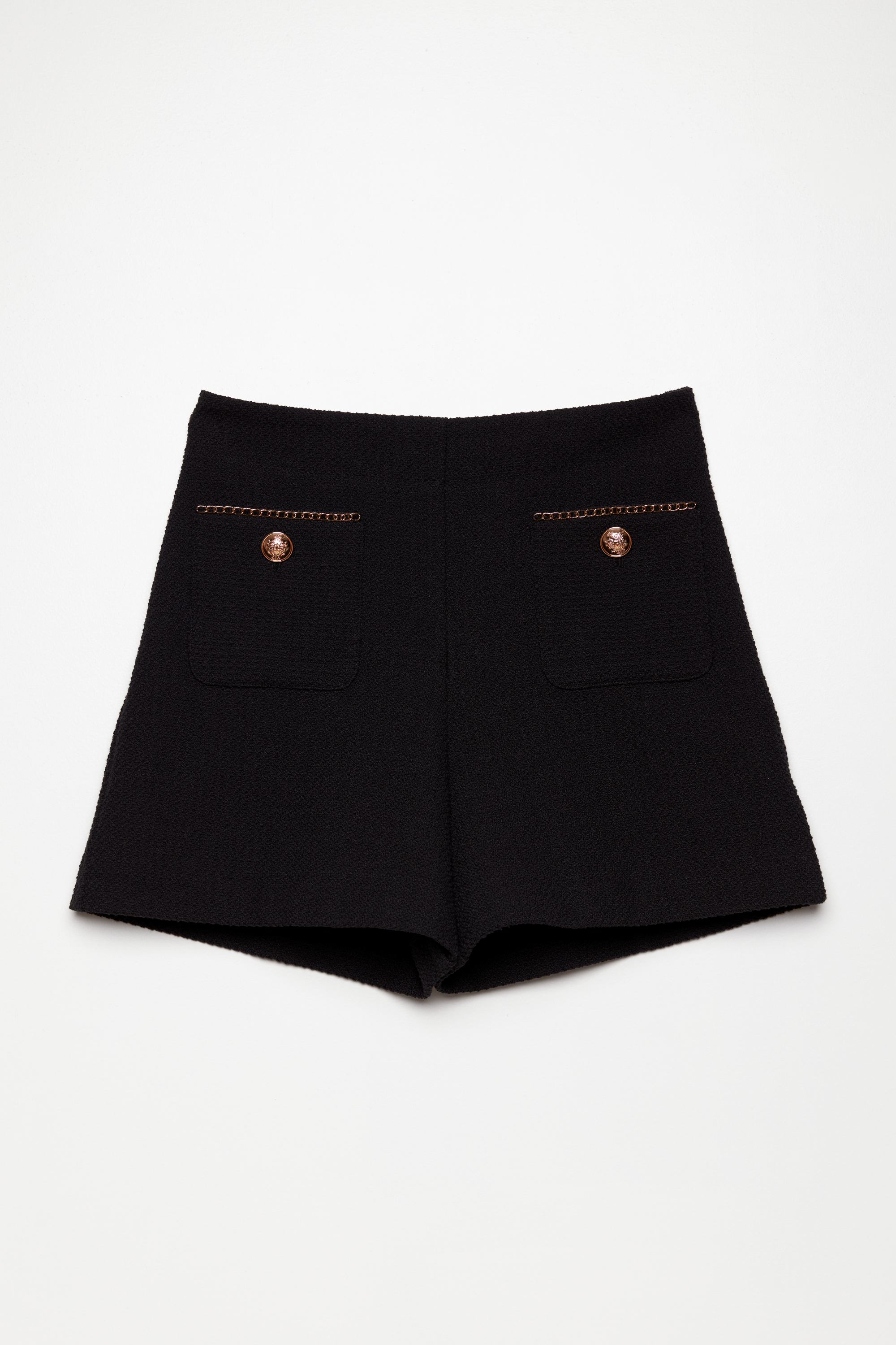 Шорты мини твидовые. Посадка изделия высокая. Перед декорирован накладными карманами. Застегиваетя на потайную молнию слева. Классическая модель, которая идеально подойдет для создания женственных образов по любому случаю.
