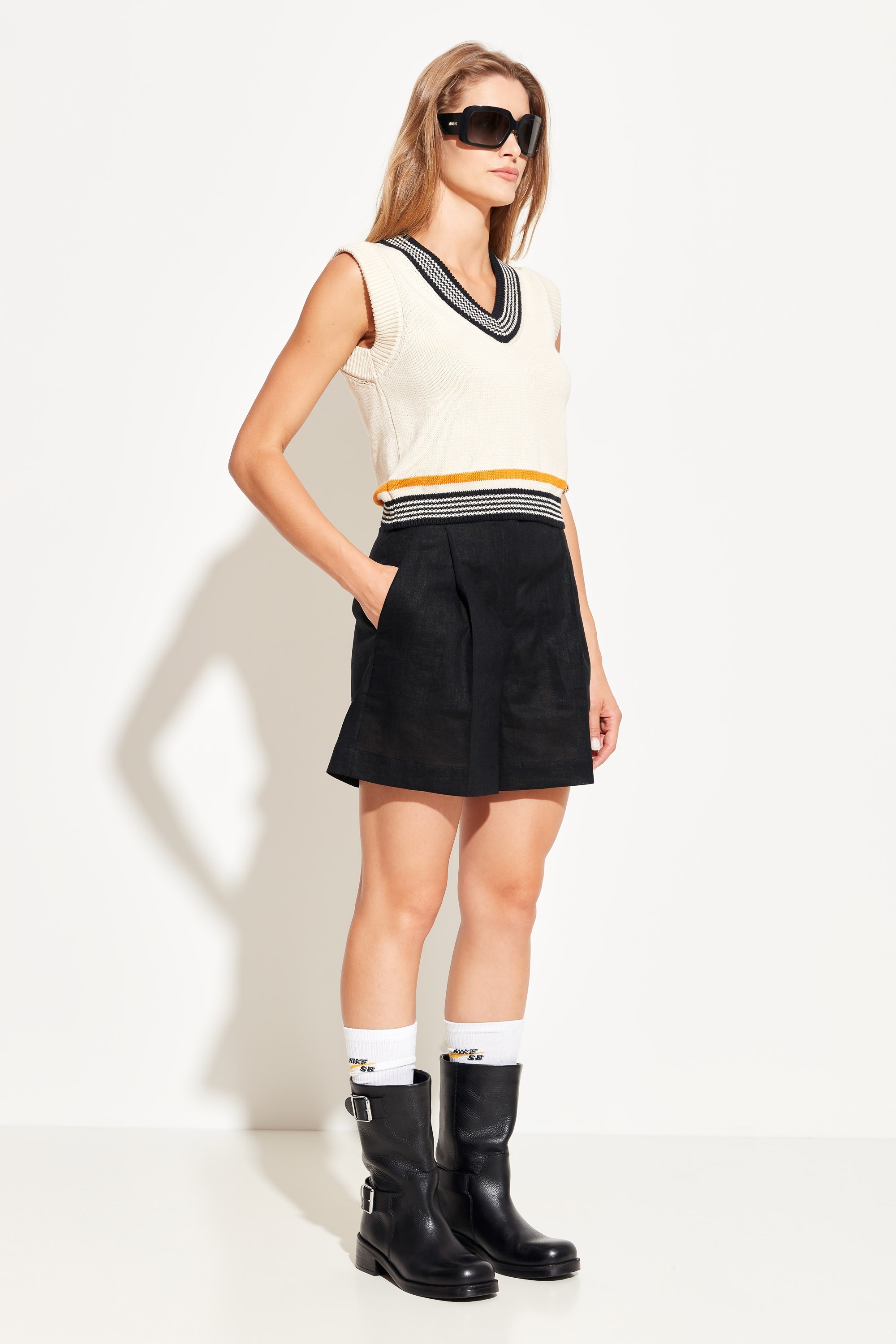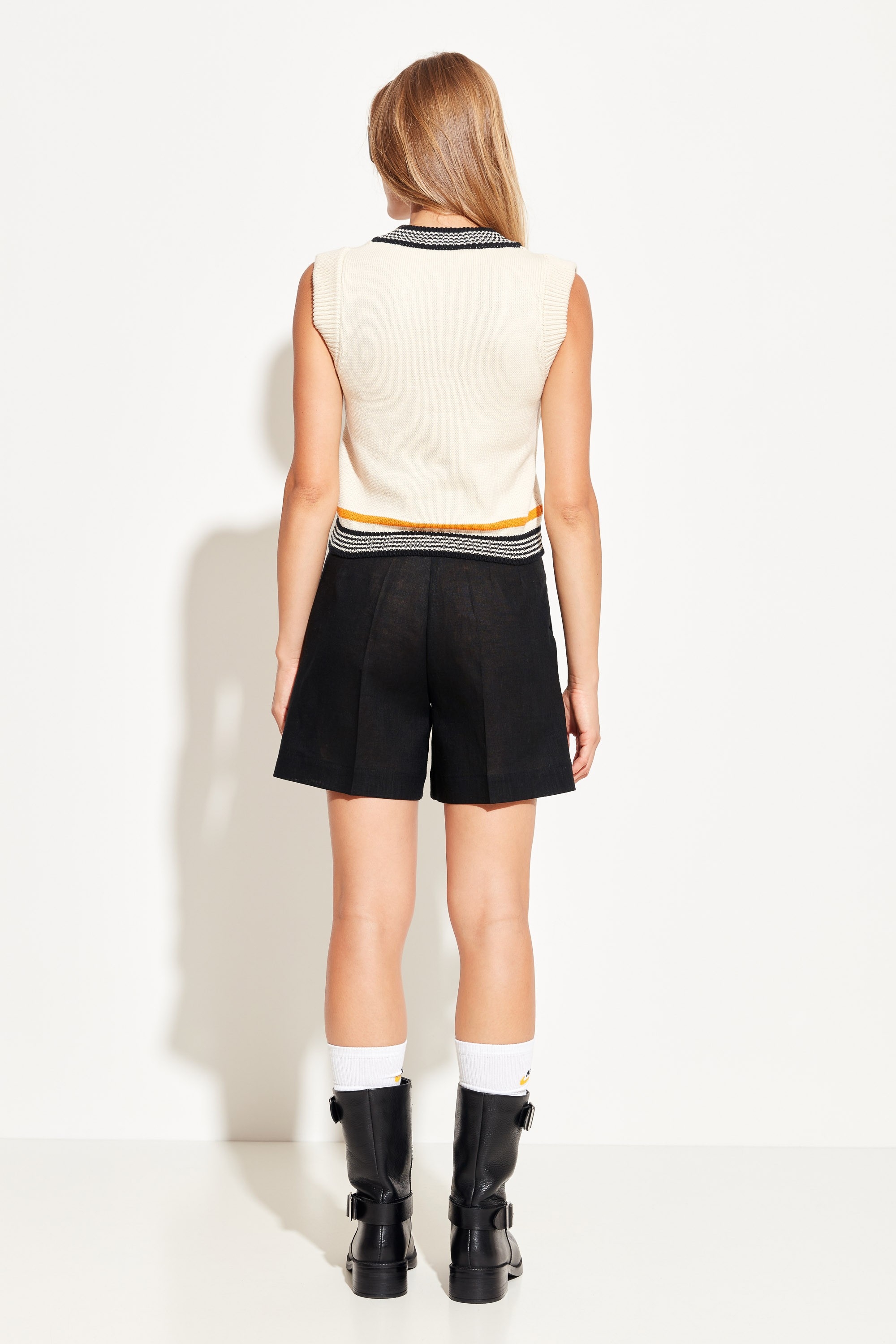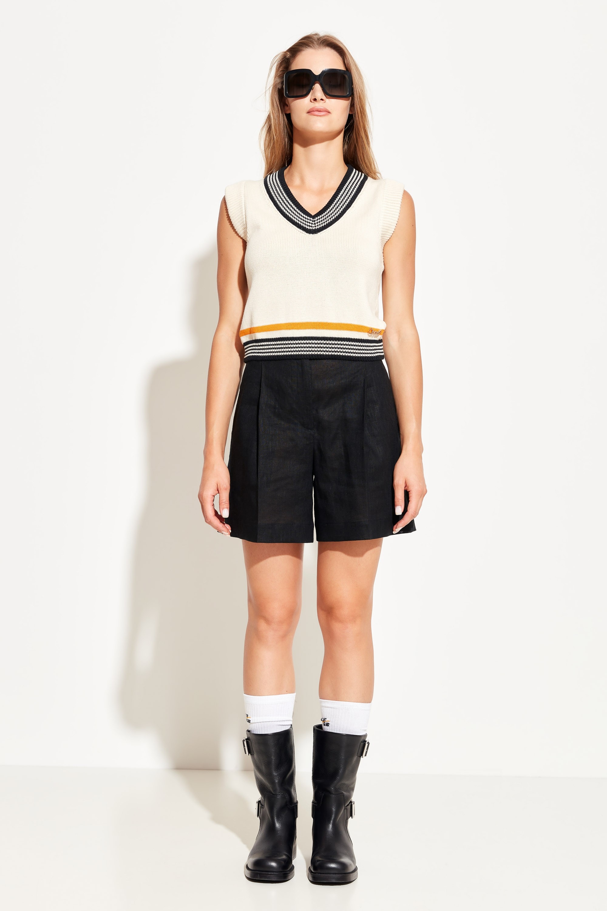 Шорты полуприлегающего силуэта, расширенные от линии бедер к низу. По бокам отрезные карманы. Шорты с заутюженными кантами. Классическая модель, которая подойдет к любому типу гардероба.