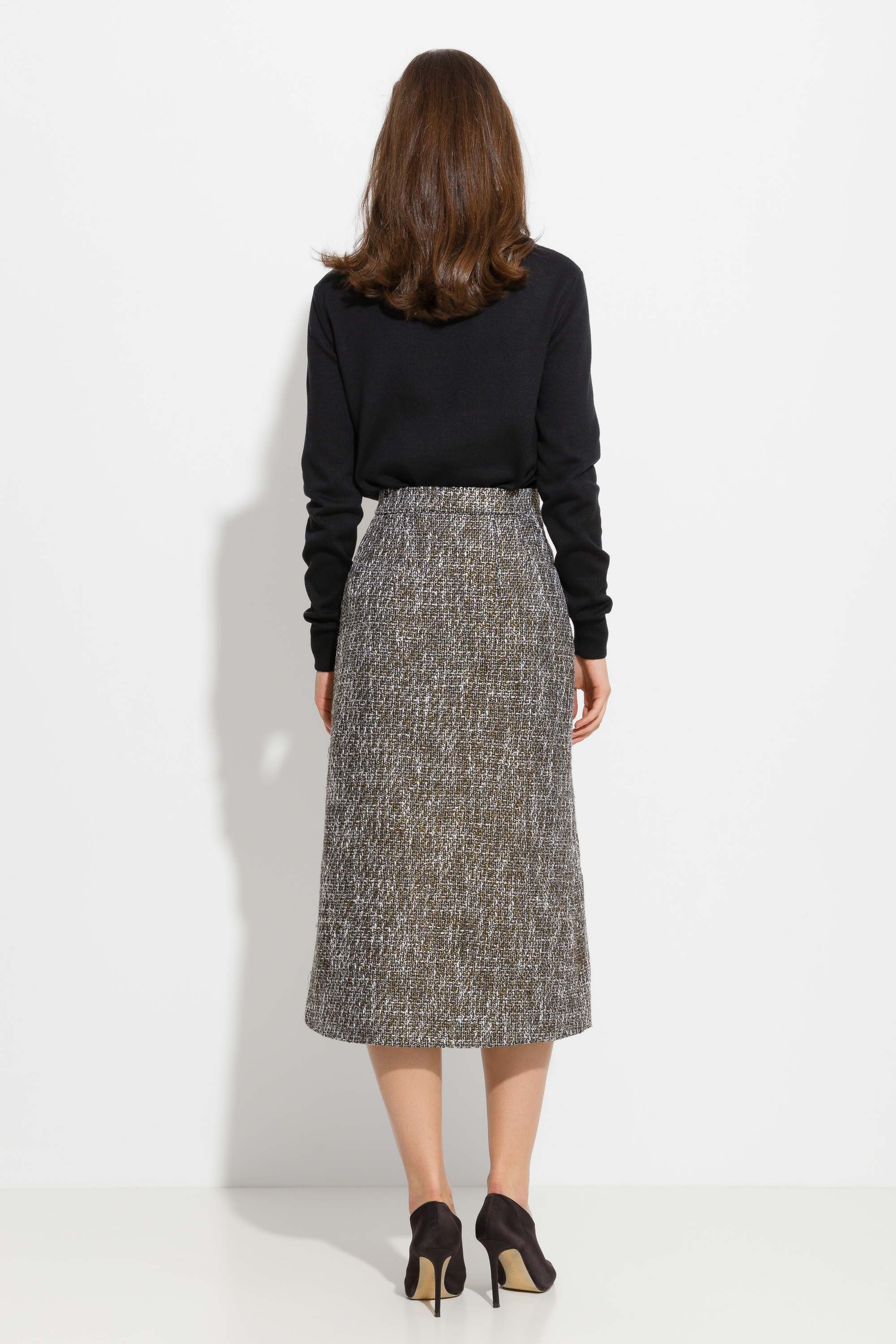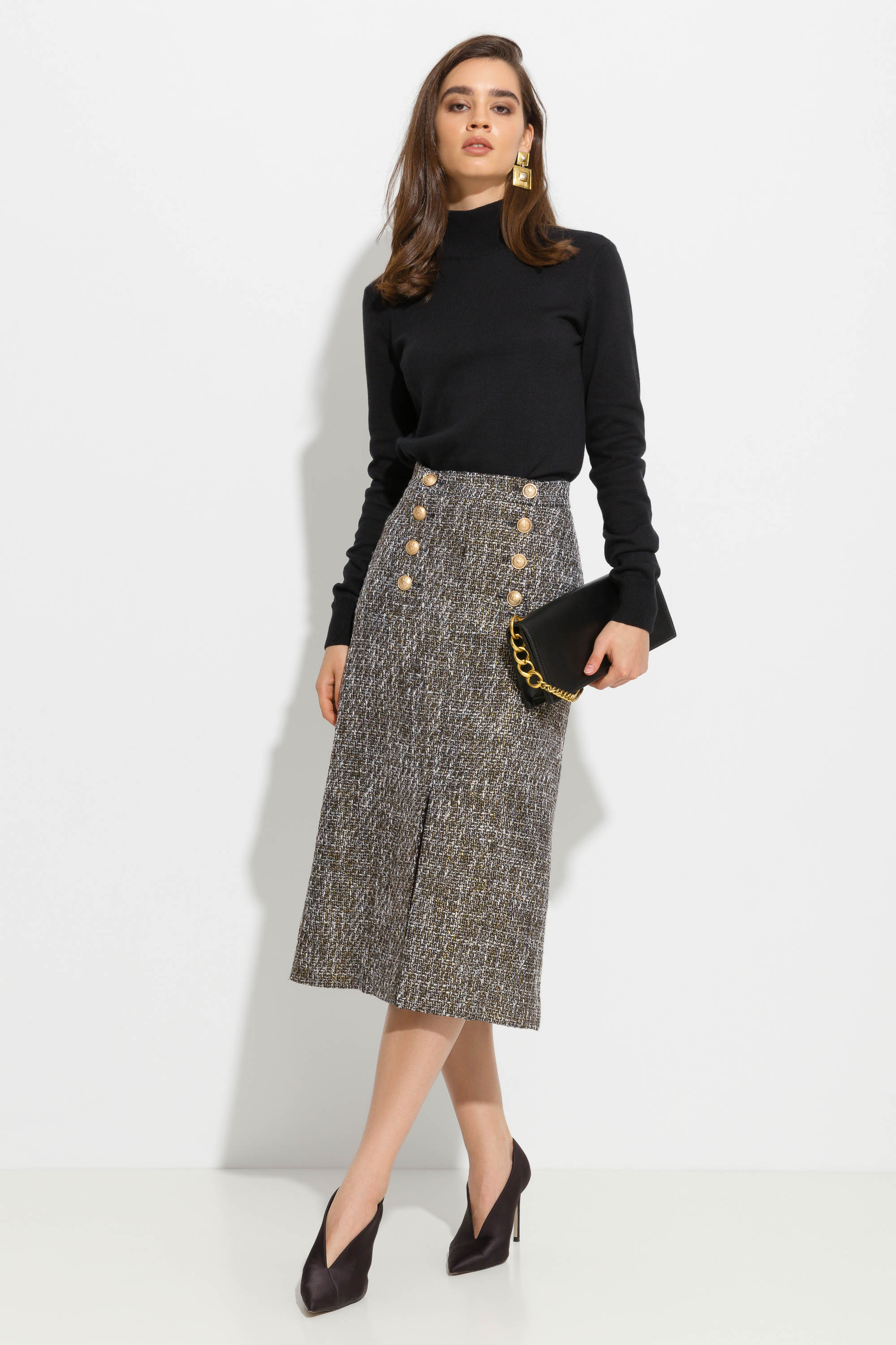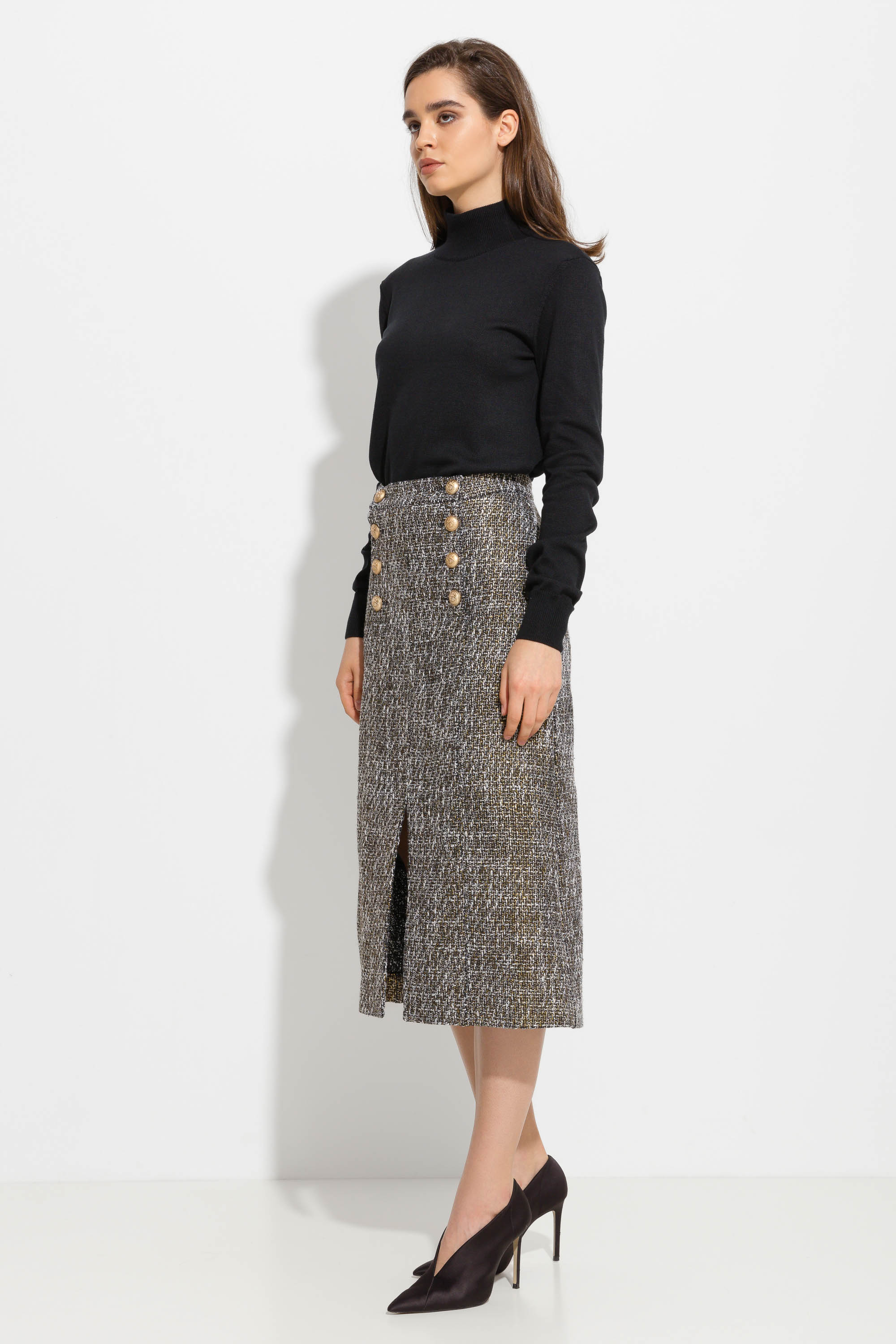 Юбка миди А-образного силуэта. Посадка изделия высокая. Перед изделия декорирован пуговицами контрастного цвета. Спереди высокий разрез. Классическая модель, которая подойдет к любому типу гардероба и по любому случаю.