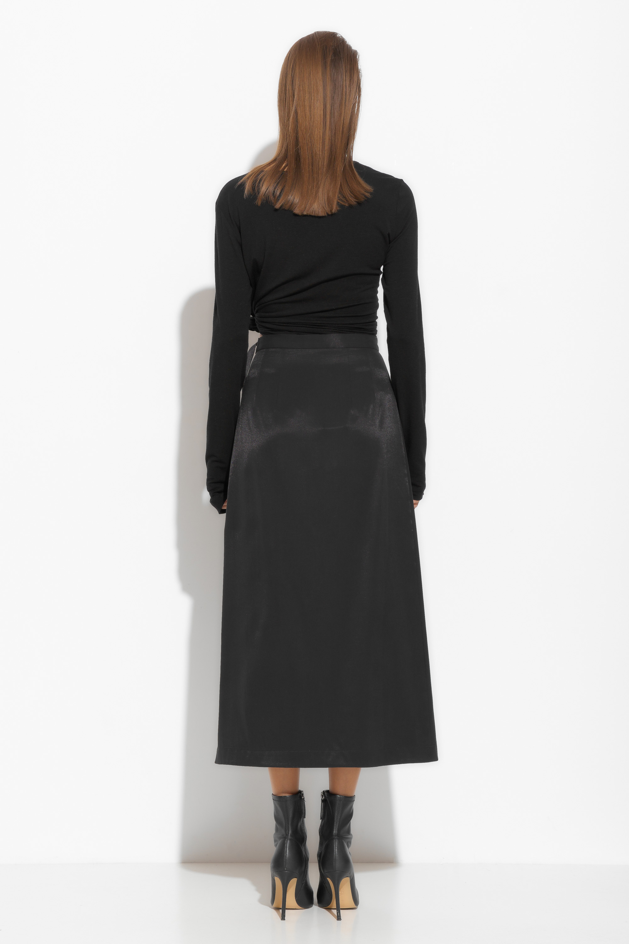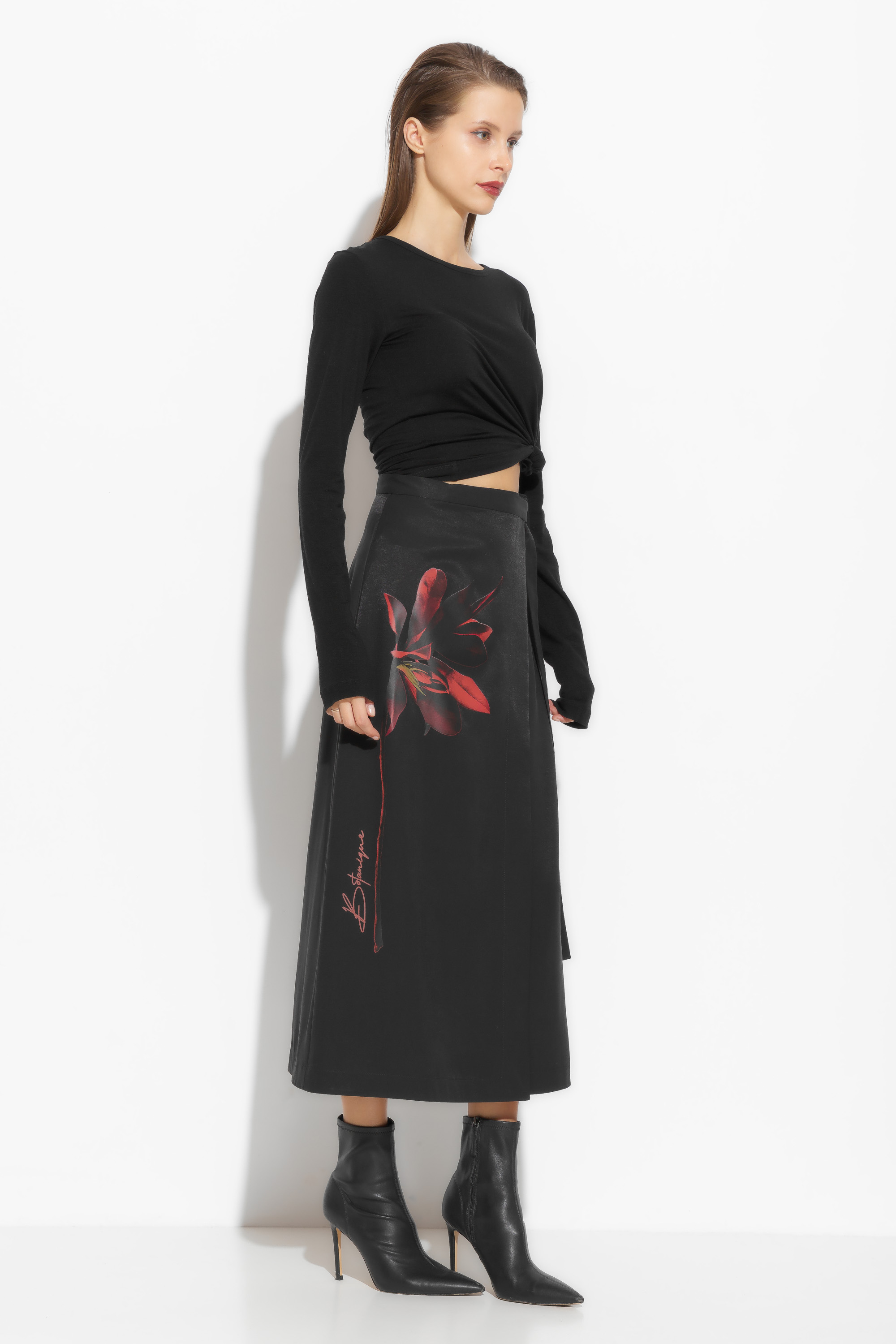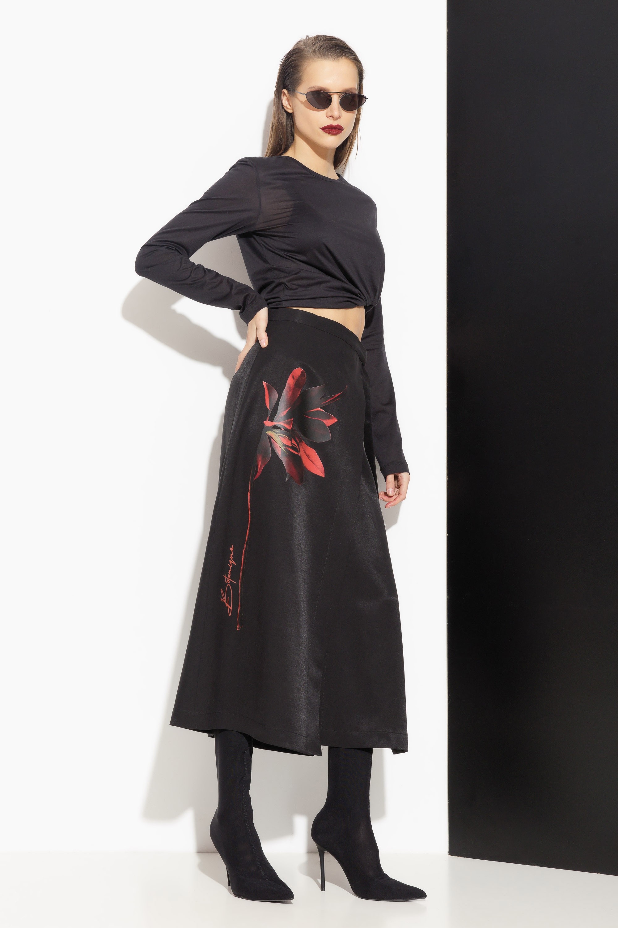 Юбка женская, полуприлегающего силуэта, длинной ниже колен, расширенная от линии бедер к низу, на притачном поясе, застёгивающимся на один крючок и одну потайную пуговицу, с запахом, без подкладки. Передние части юбки цельные с цельнокроеной планкой, правая часть декорирована принтом. Задняя часть юбки цельнокроеная с четырьмя выточками. Пояс юбки с правой стороны с цельнокроеной завязкой, на левой части по поясу настрочена завязка. По левому боковому шву в нижней части разрез.