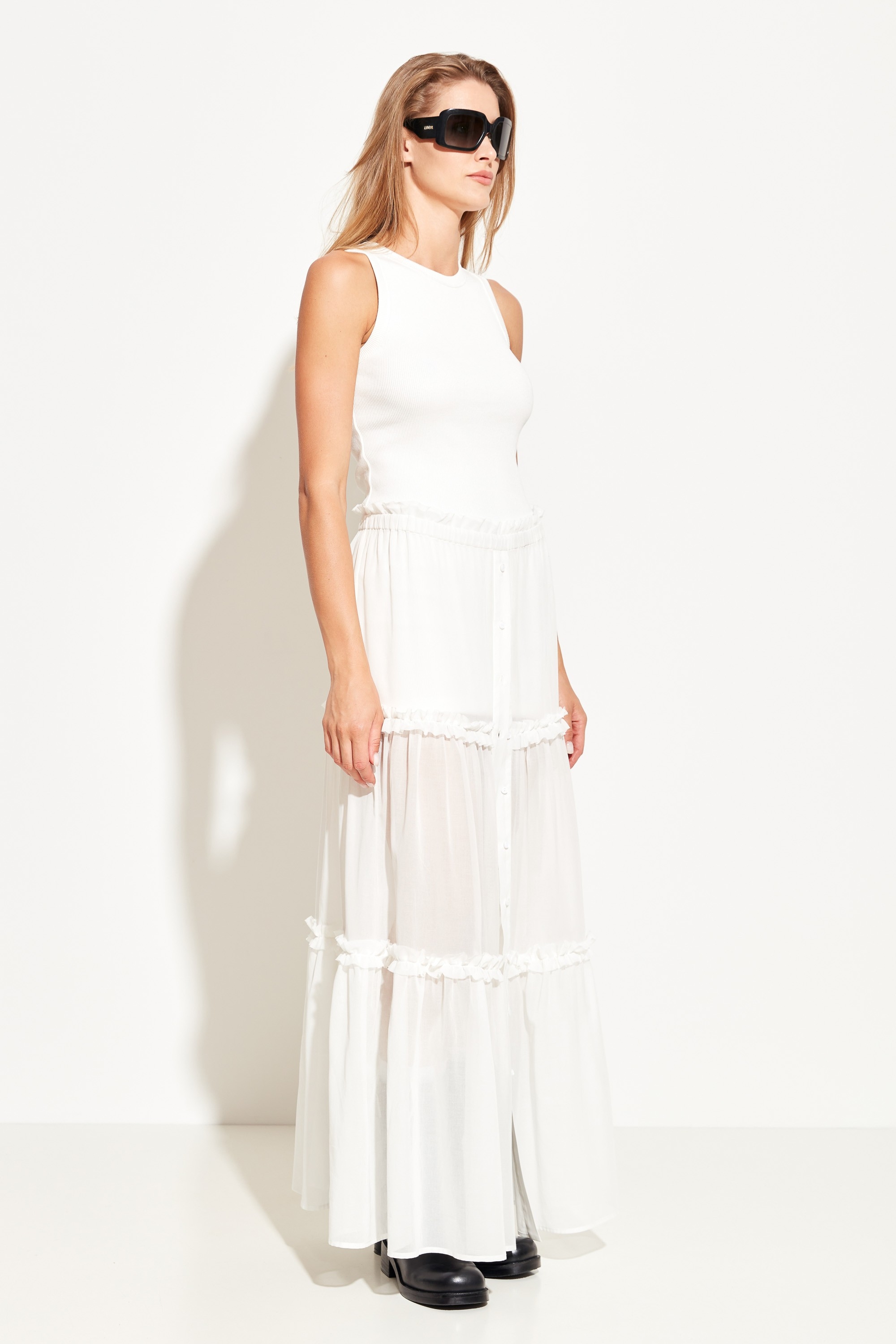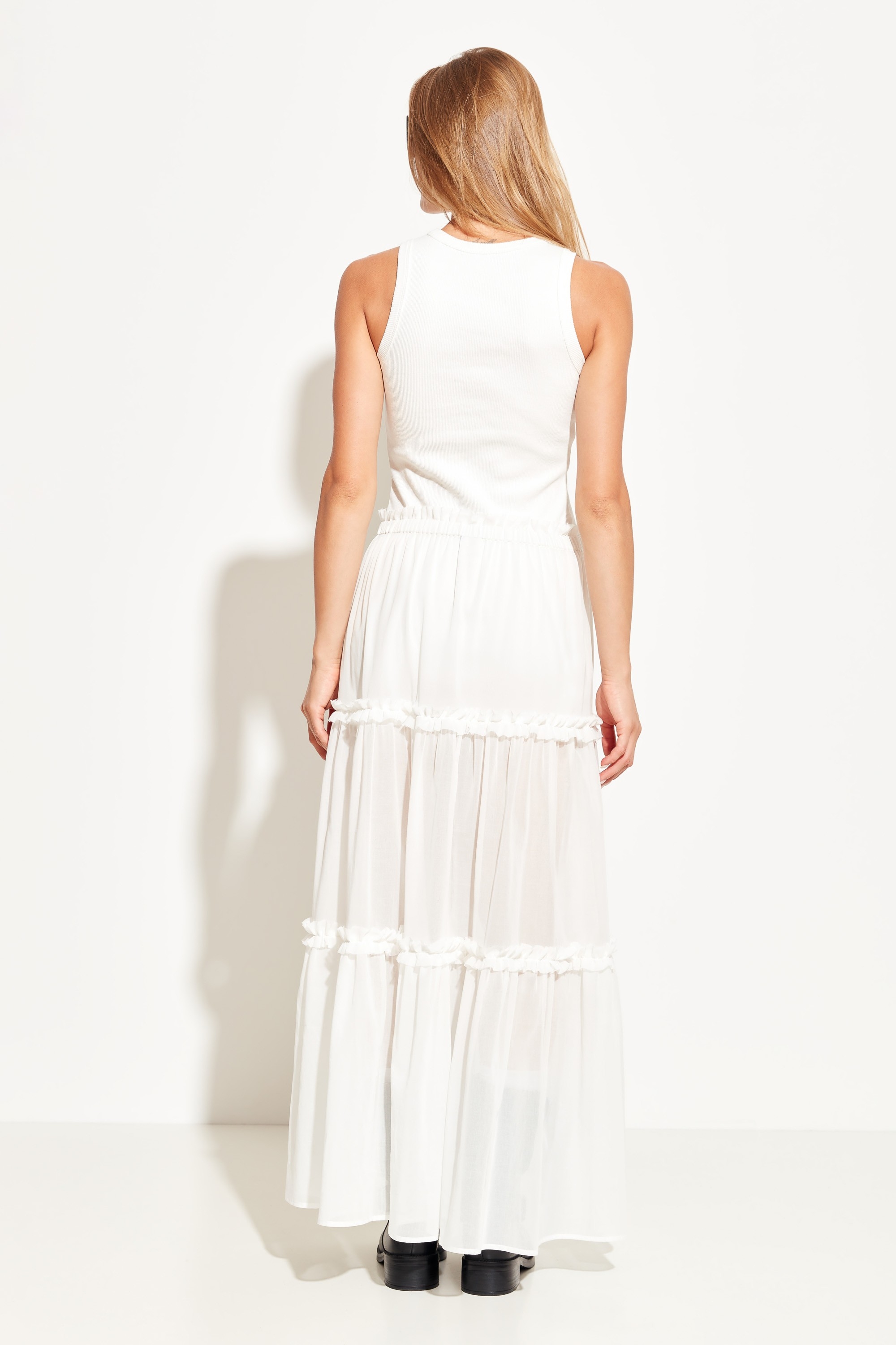 Юбка А-образного силуэта, в длине макси. Пояс на эластичной резинке ,что обеспечивает комфортную посадку изделия. Юбка декорирована воланами, которые добавляют образу легкости и романтичности. Комфортная, трендовая модель для создания стильных летних аутфитов.