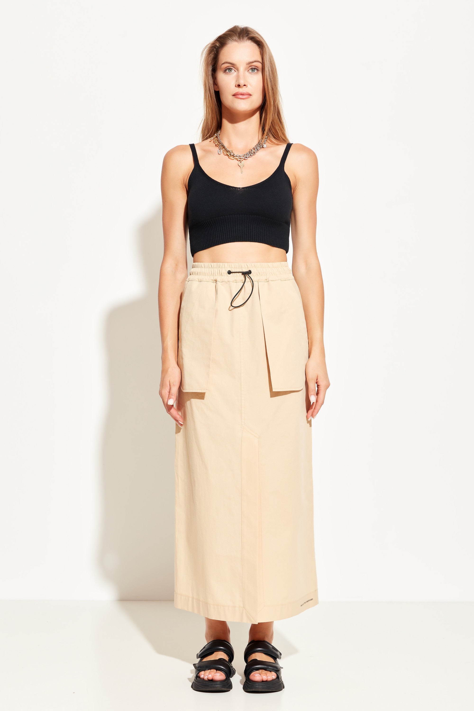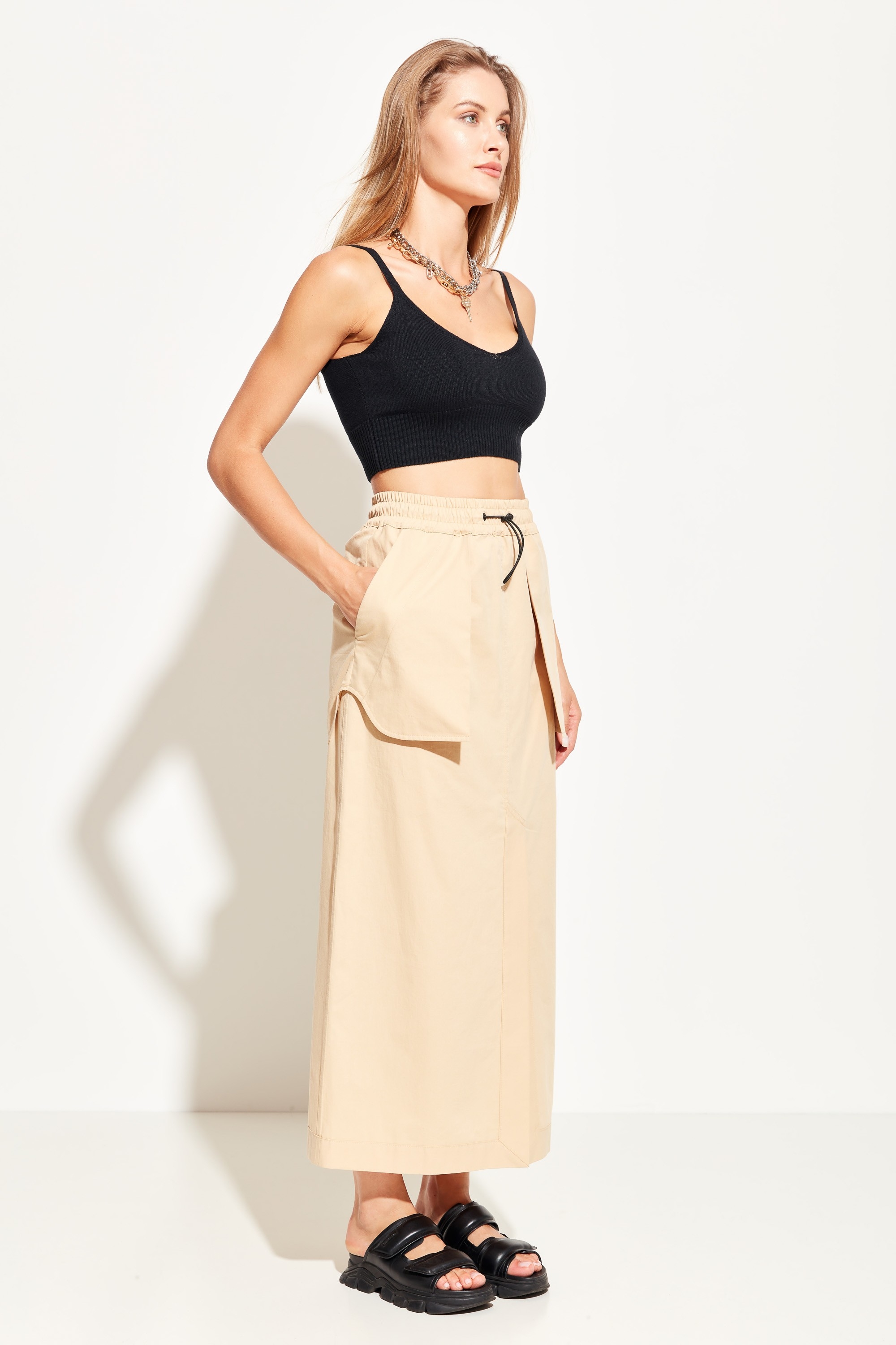 Юбка прямого силуэта в длине миди. Пояс на эластичной резинке, что гарантирует комфортную посадку изделия. В пояс вшиты объемные накладные карманы, которые добавляют образу незаурядности. Юбка с разрезом. Универсальная модель, которая подойдет к любому типу гардероба.
