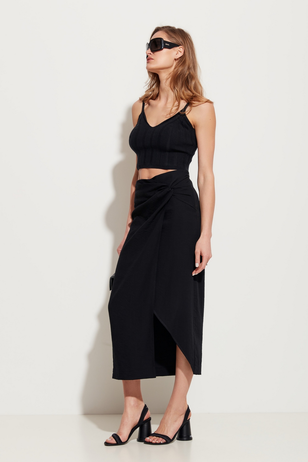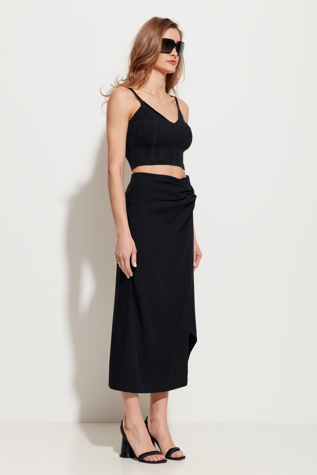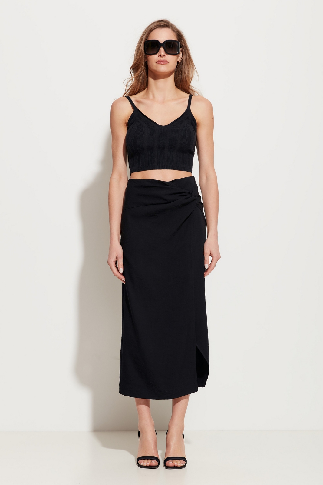 Юбка полуприлегающего силуэта в длине миди. На талии декор в виде драпировки ткани. Спереди эффектный разрез. Посадка изделия средняя. Стильная модель для создания трендовых и комфортных городских аутфитов.