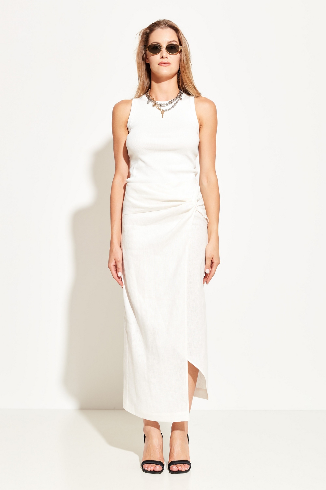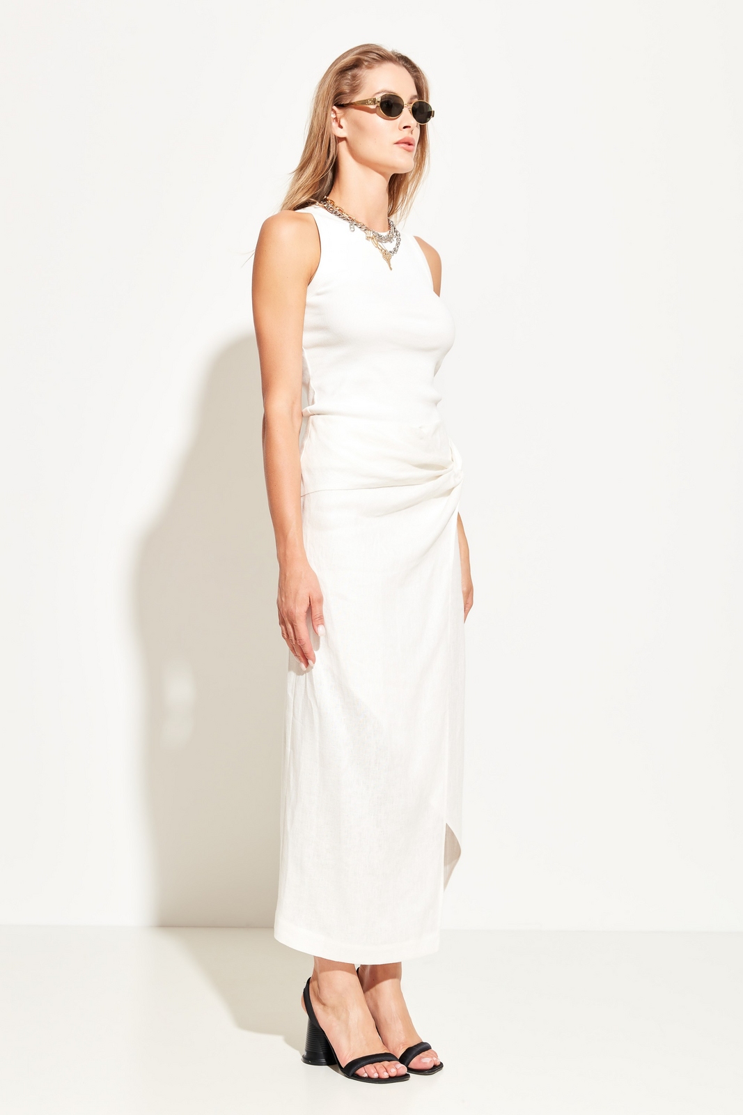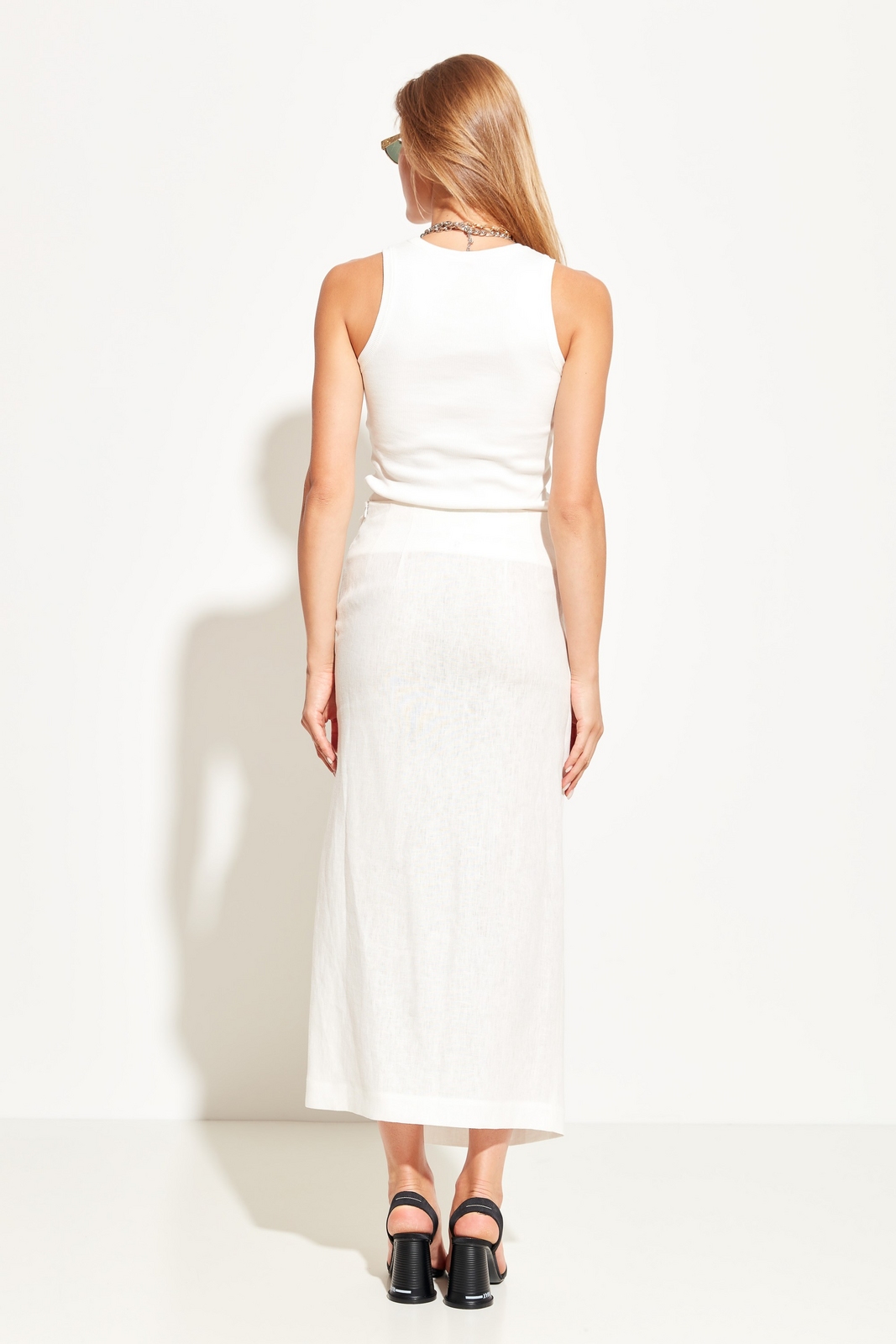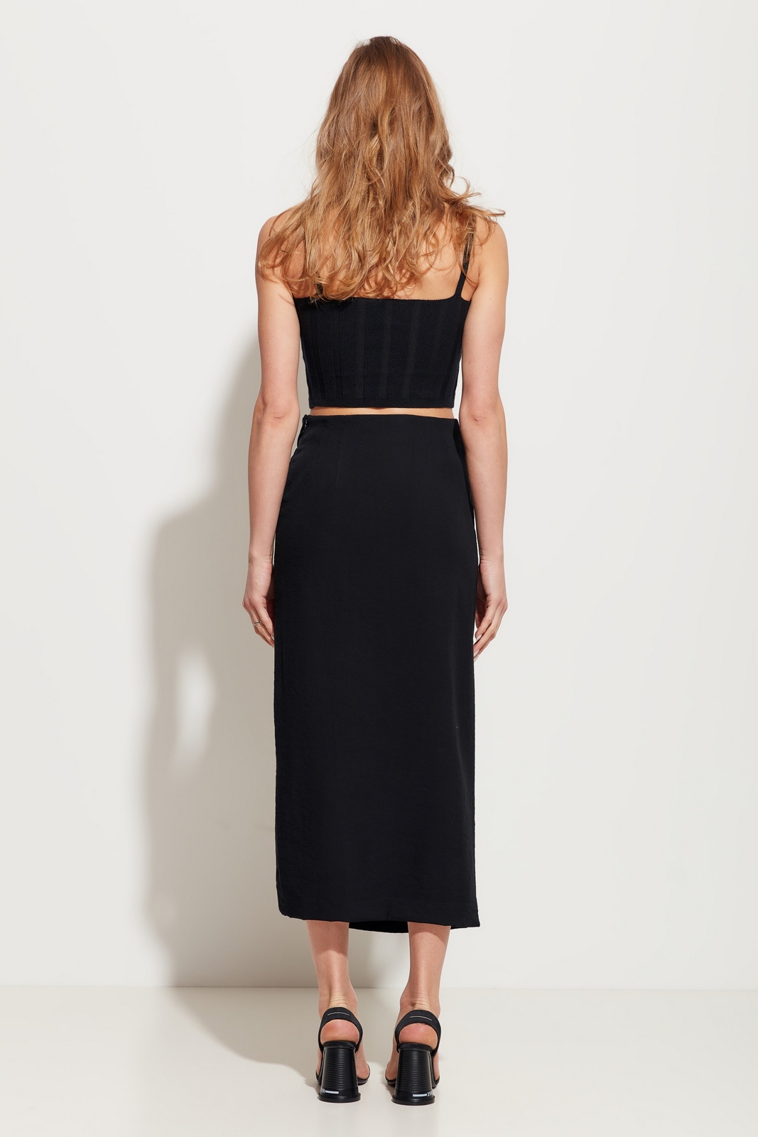 Юбка полуприлегающего силуэта в длине миди. На талии декор в виде драпировки ткани. Спереди эффектный разрез. Посадка изделия средняя. Стильная модель для создания трендовых и комфортных городских аутфитов.