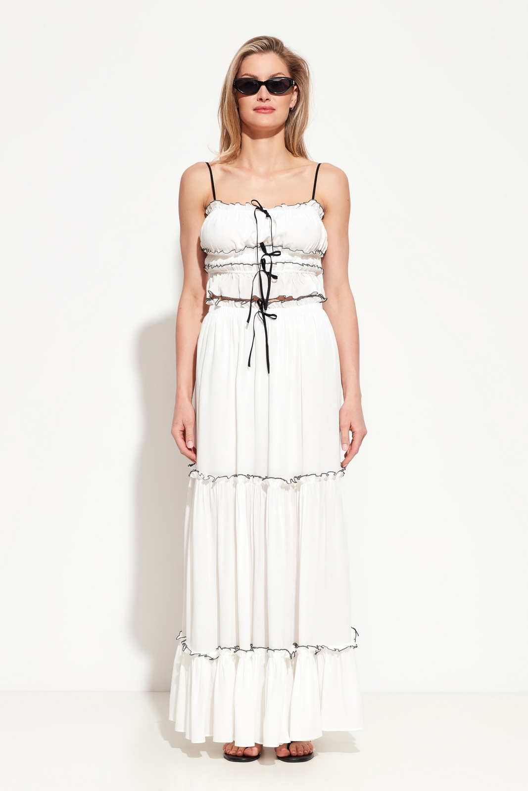 Юбка полуприлегающего силуэта в длине макси. Пояс изделия на эластичной резинке, что обеспечивает комфортную посадку в процессе носки. Нижняя часть декорирована объемным воланом. Юбка станет идеальным помощником в создании эффектных летних образов по любому случаю.
