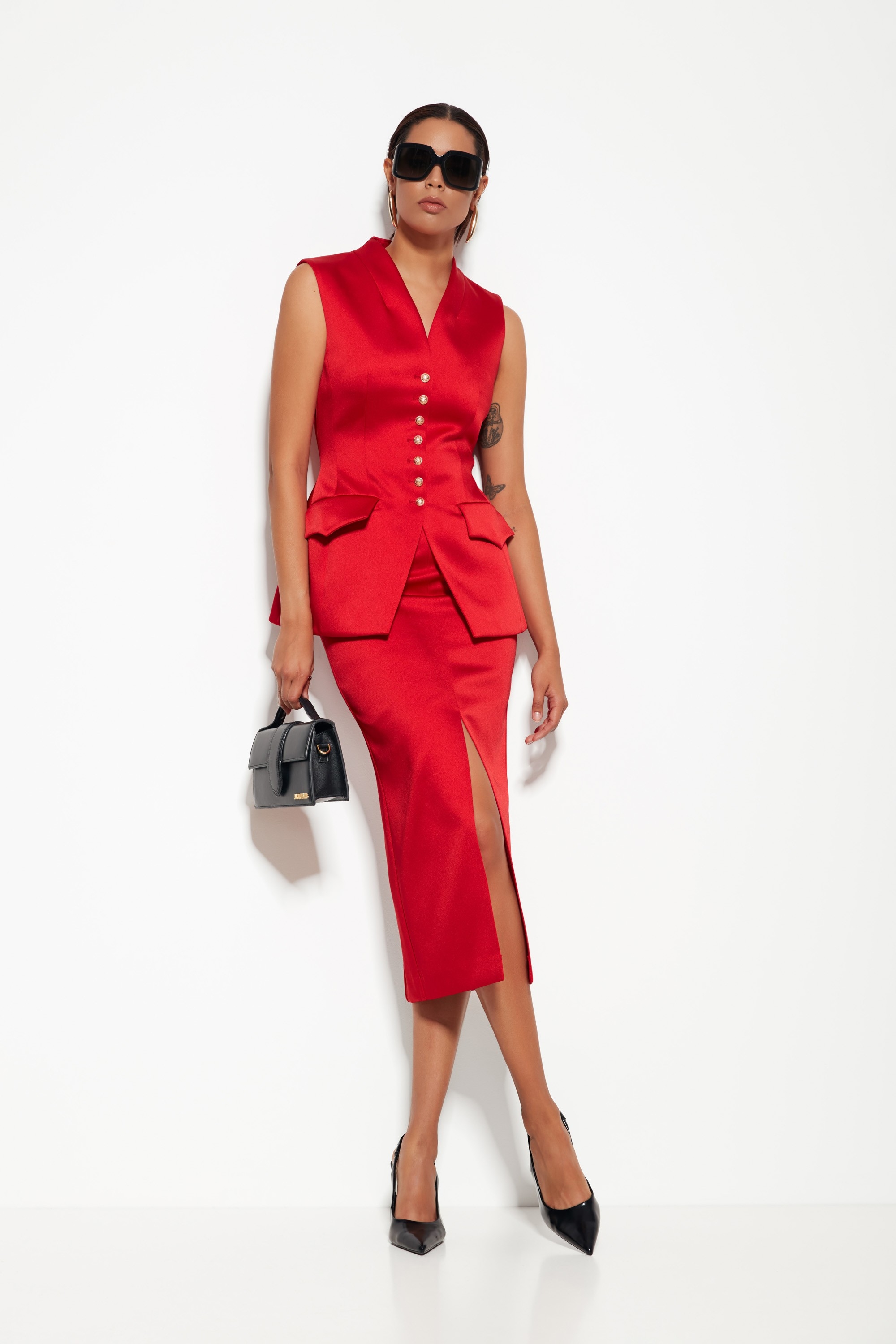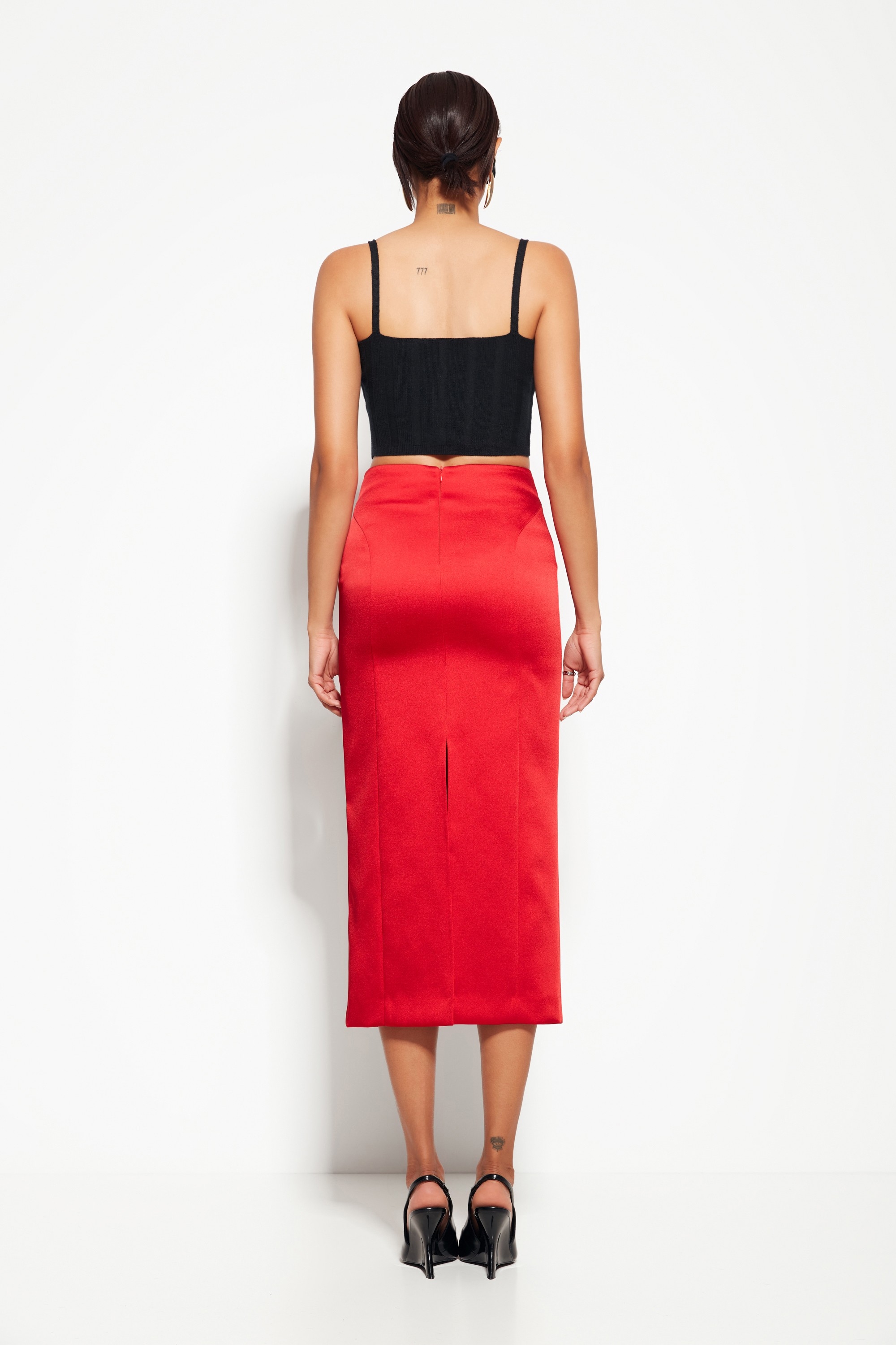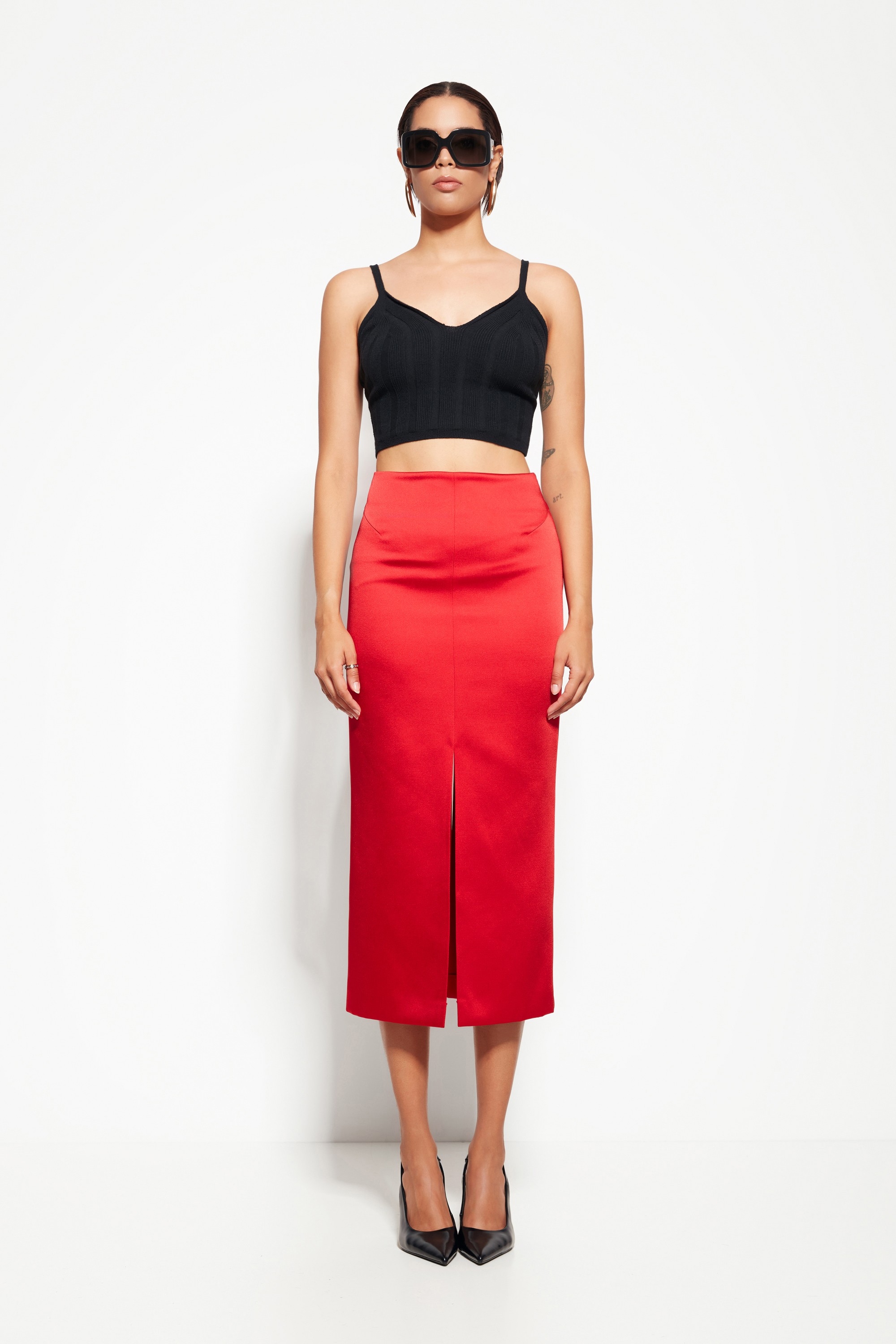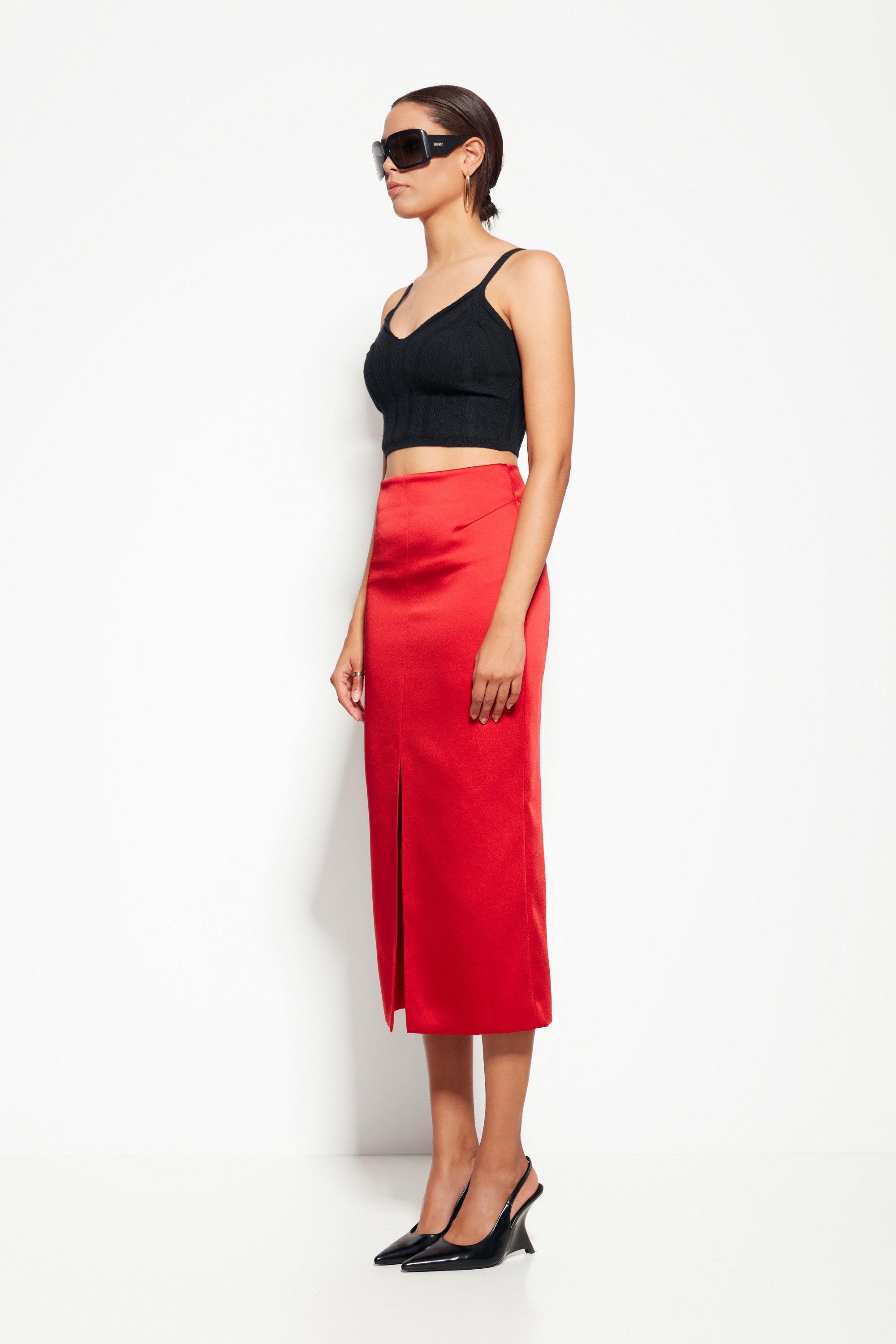 Модель из коллекции Party 2026 — юбка миди с разрезом, создающая изящный и динамичный силуэт. Минималистичный дизайн делает акцент на линии юбки и разрезе, придавая образу утончённость и стиль.