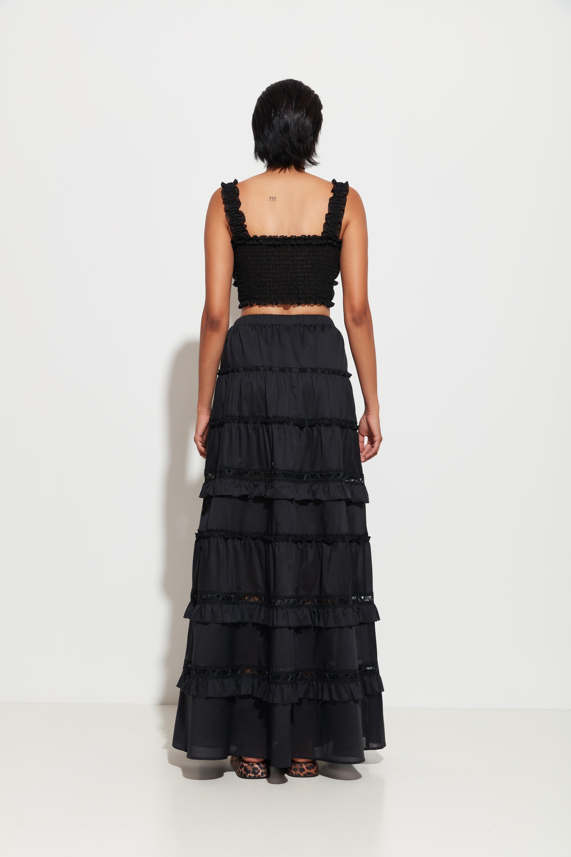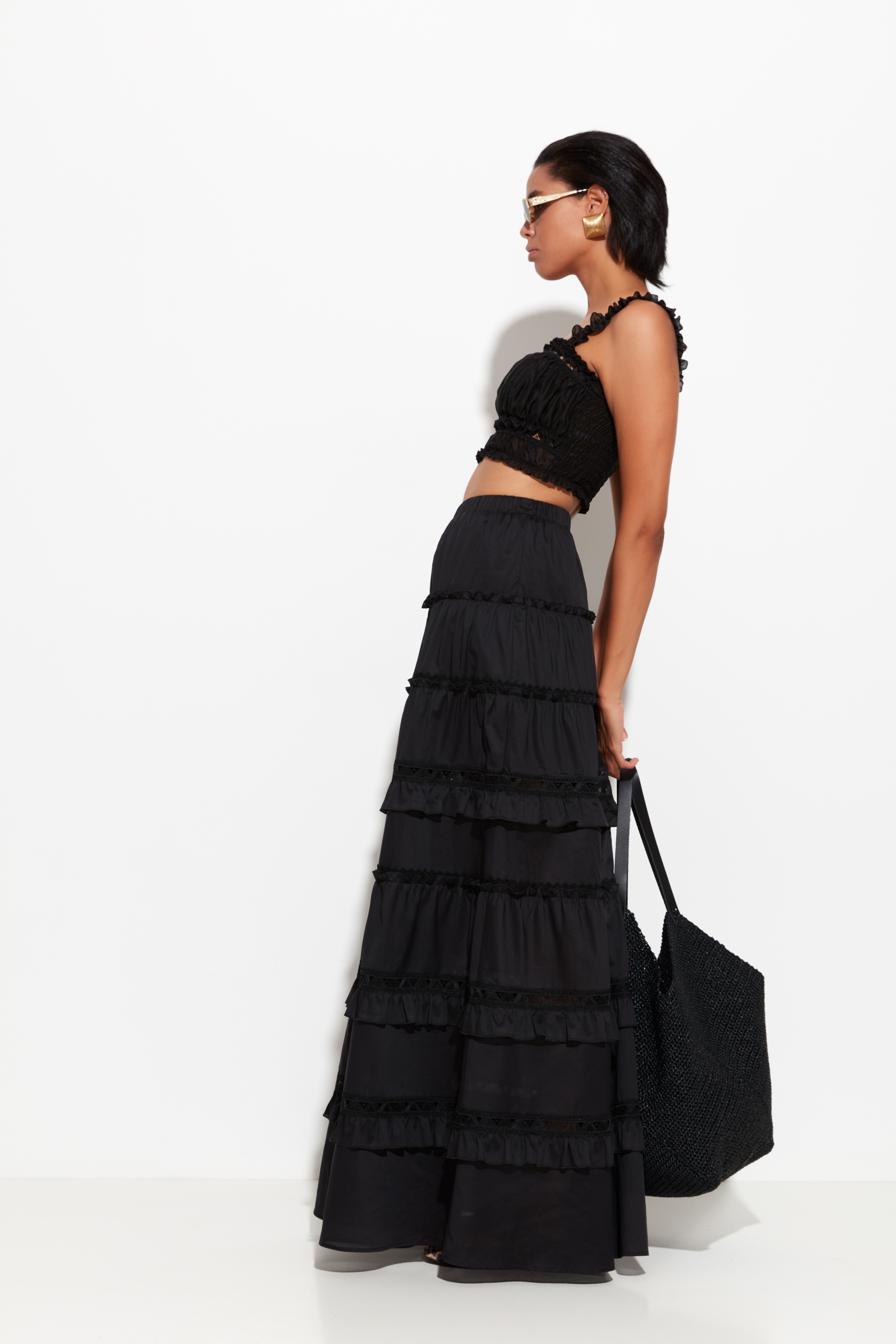 Юбка Lakbi 55589 — изящная модель в длине макси с воланами и кружевными вставками, которая создаёт воздушный, романтичный образ. Мягкая резинка на поясе обеспечивает комфортную посадку и подчёркивает линию талии, а декоративные элементы добавляют текстурный интерес и утончённость. Эта юбка становится универсальной деталью летнего гардероба, легко сочетаясь с различными верхами и аксессуарами.