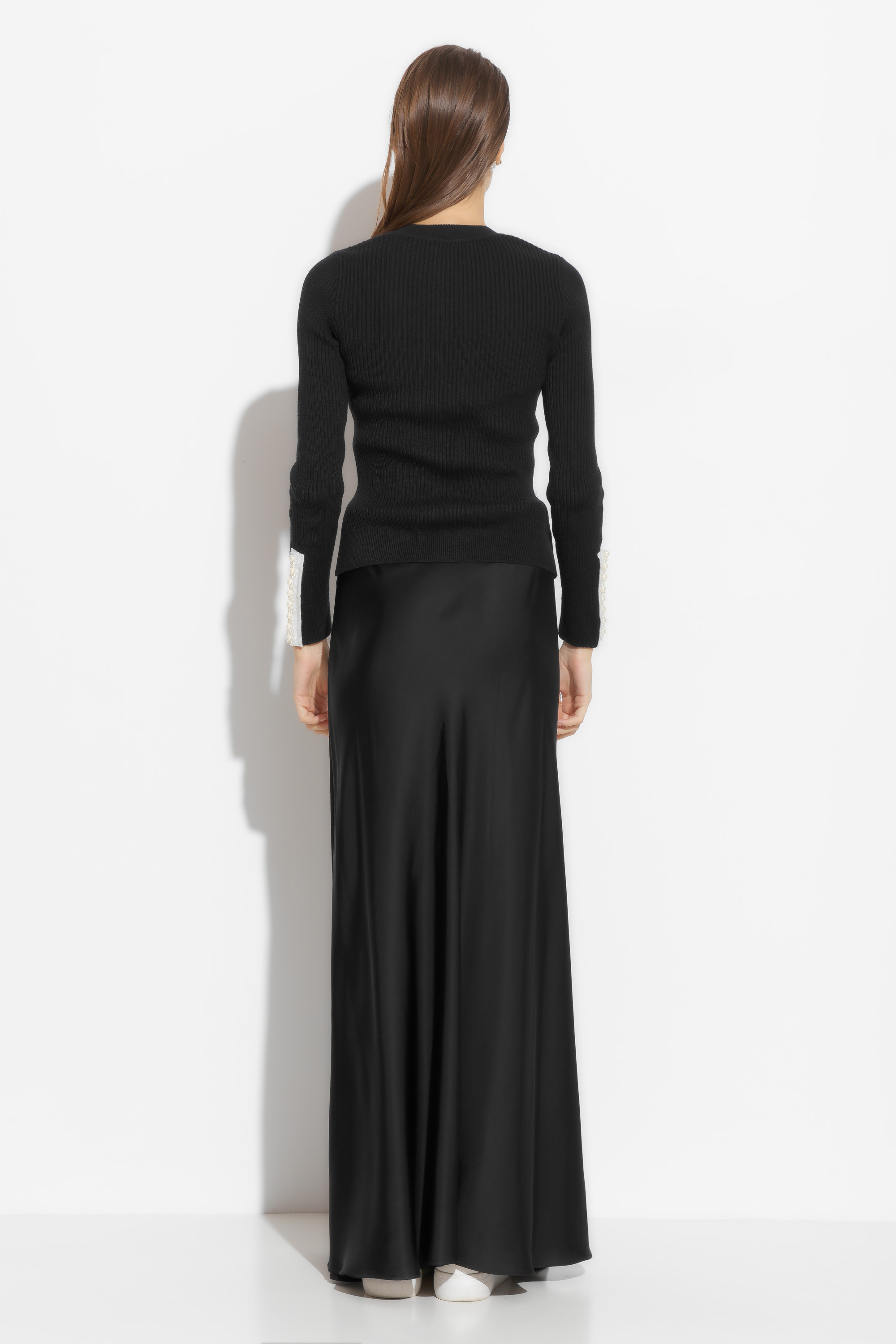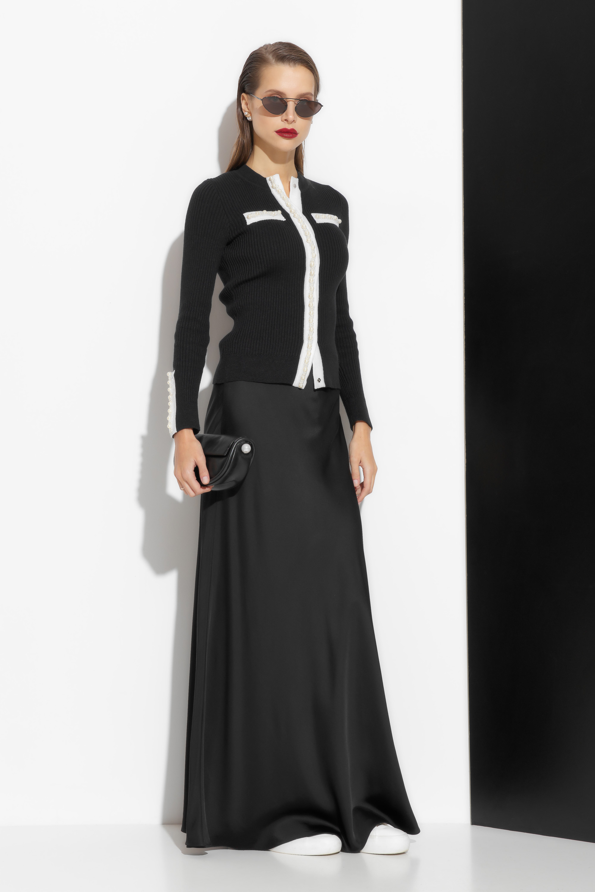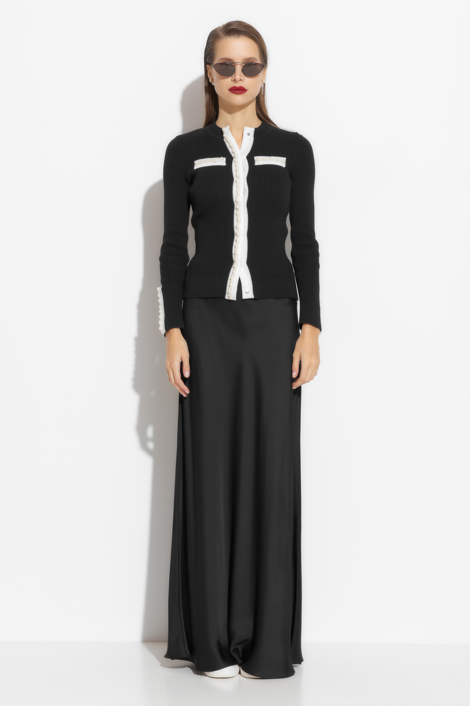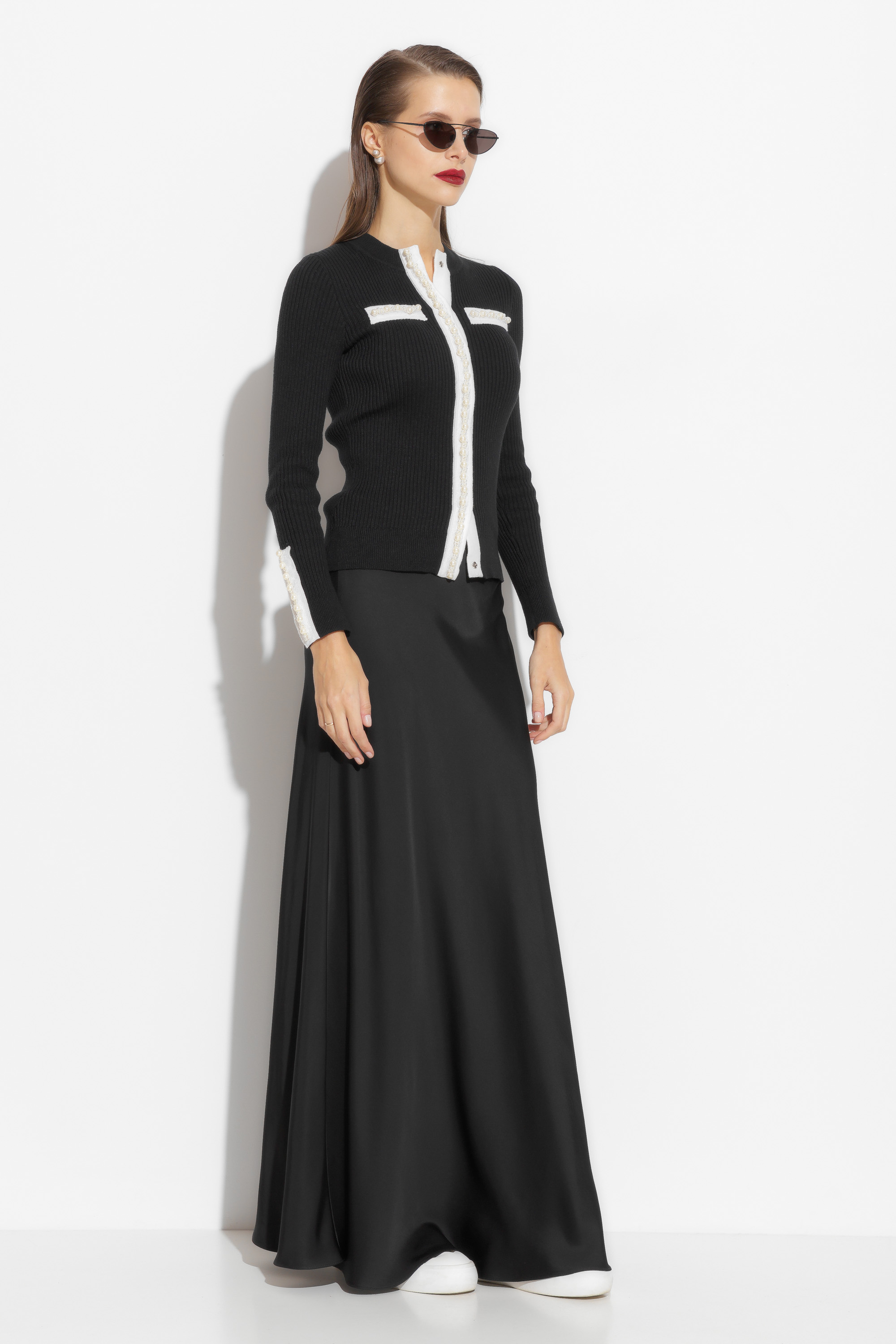 Жакет вязаный прилегающего силуэта, длиной выше линии бедер. Округлый вырез горловины. Перед изделия и рукава декорированы нашивками в виде жемчужин, которые добавляют образу элегантности и нарядности. Комфортная модель, которая подойдет к для образов по особому случаю, так и для ежедневных аутфитов.