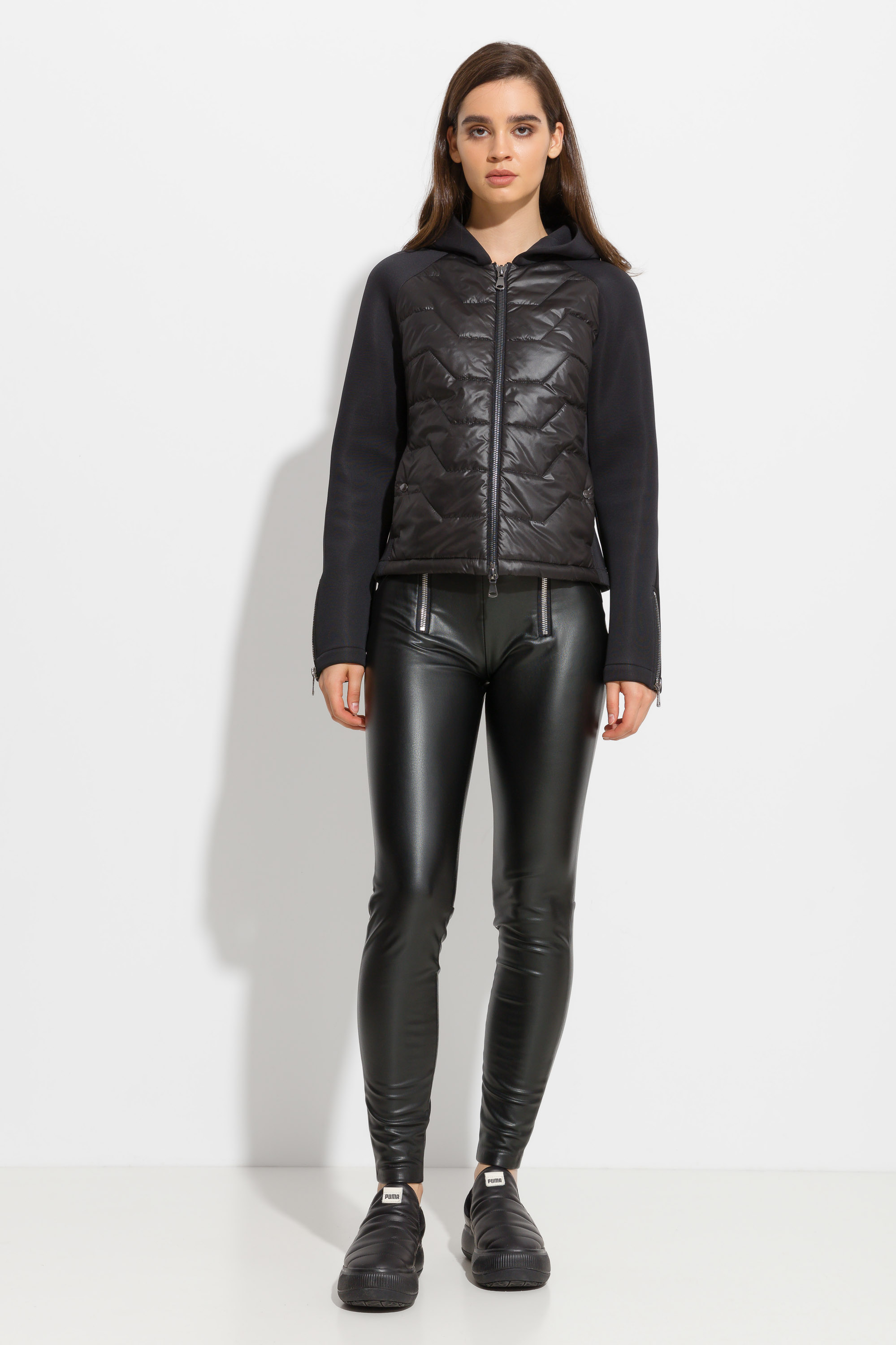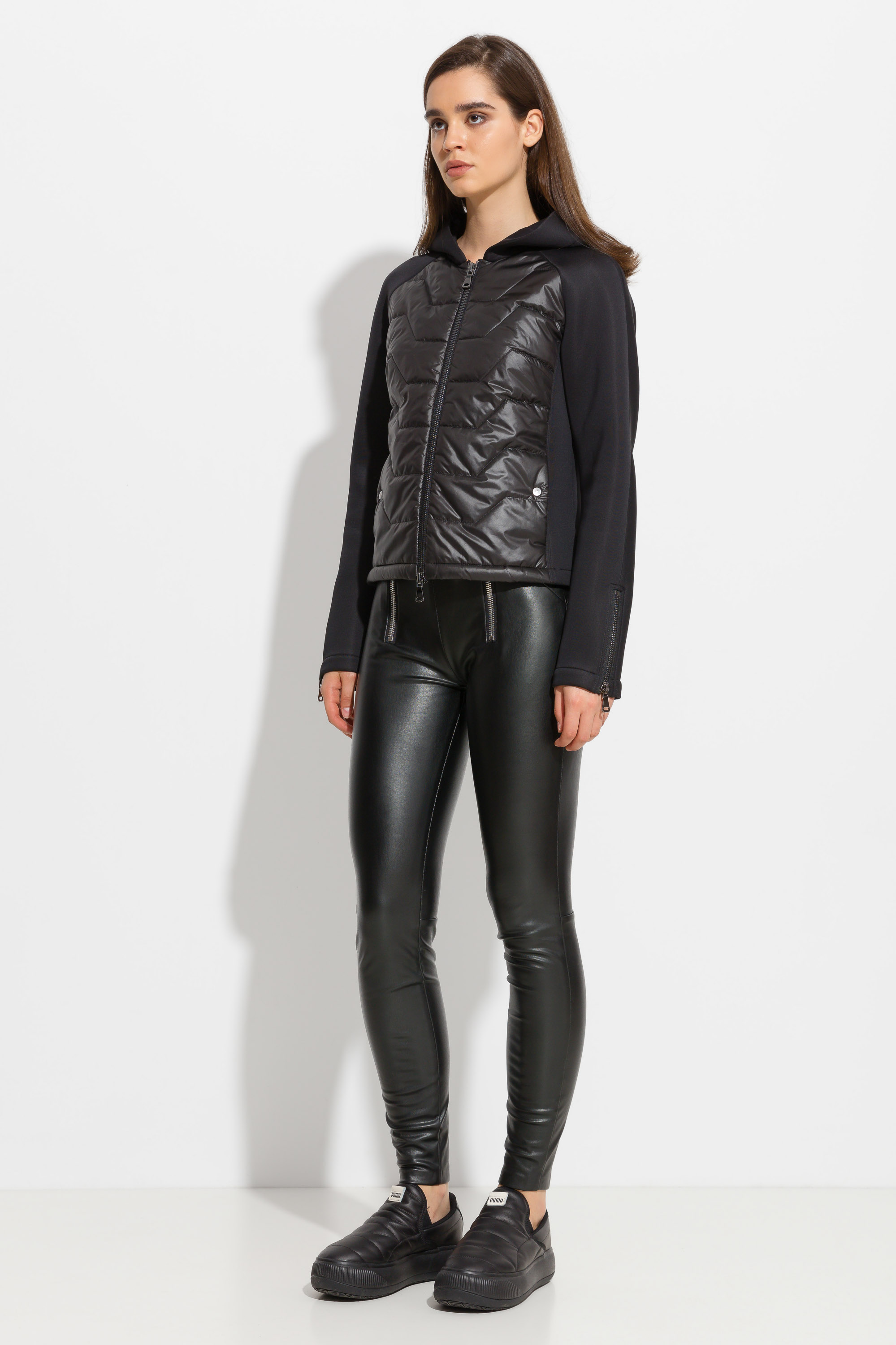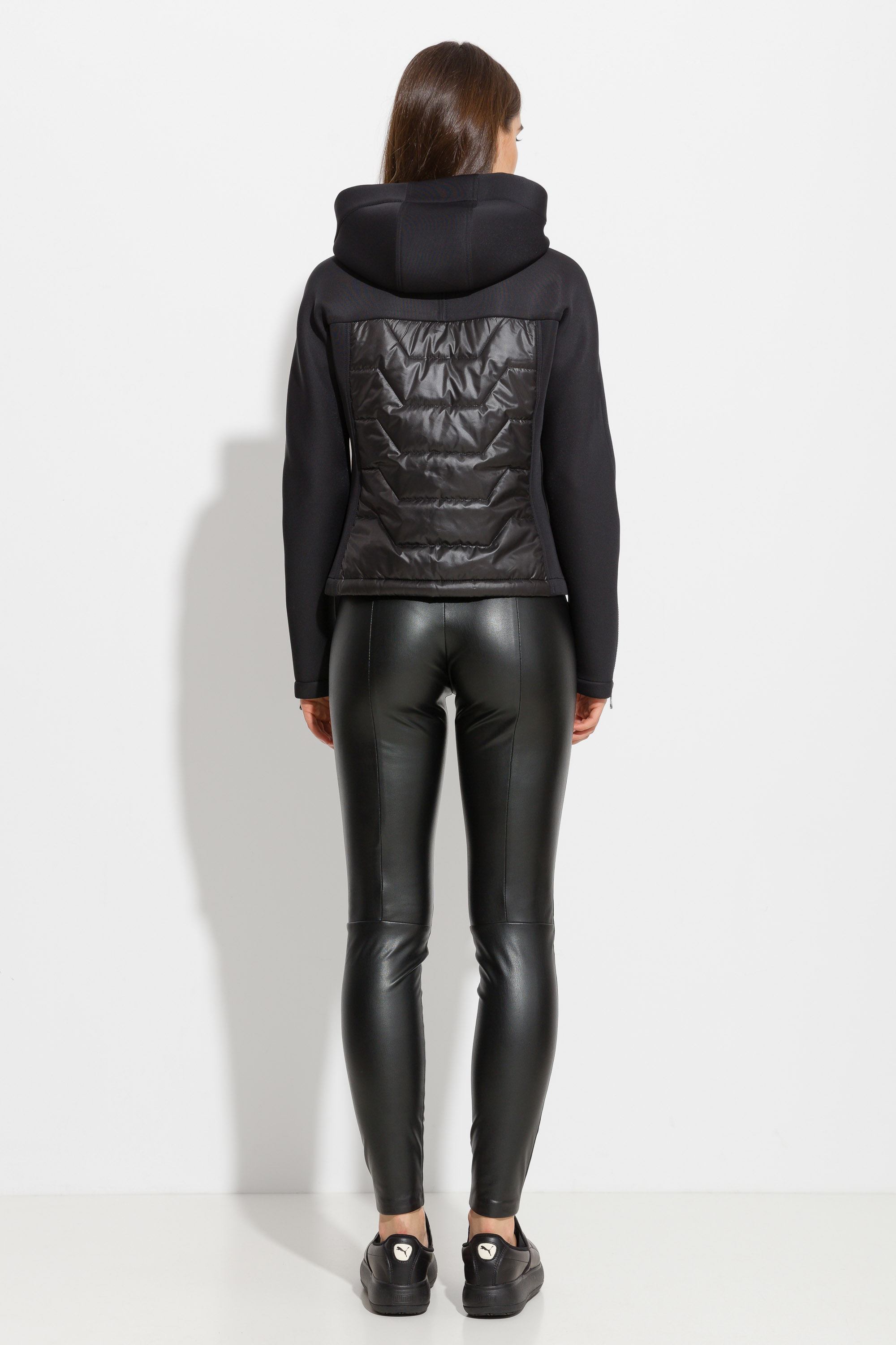 Жакет спортивный прилегающего силуэта, длиной выше линии бедер. Перед изделия утеплен и декорирован строчками. Рукава регланы с молнией по низу изделия. Модель с капюшоном. Идеальная альтернатива легким курткам и джинсовкам.