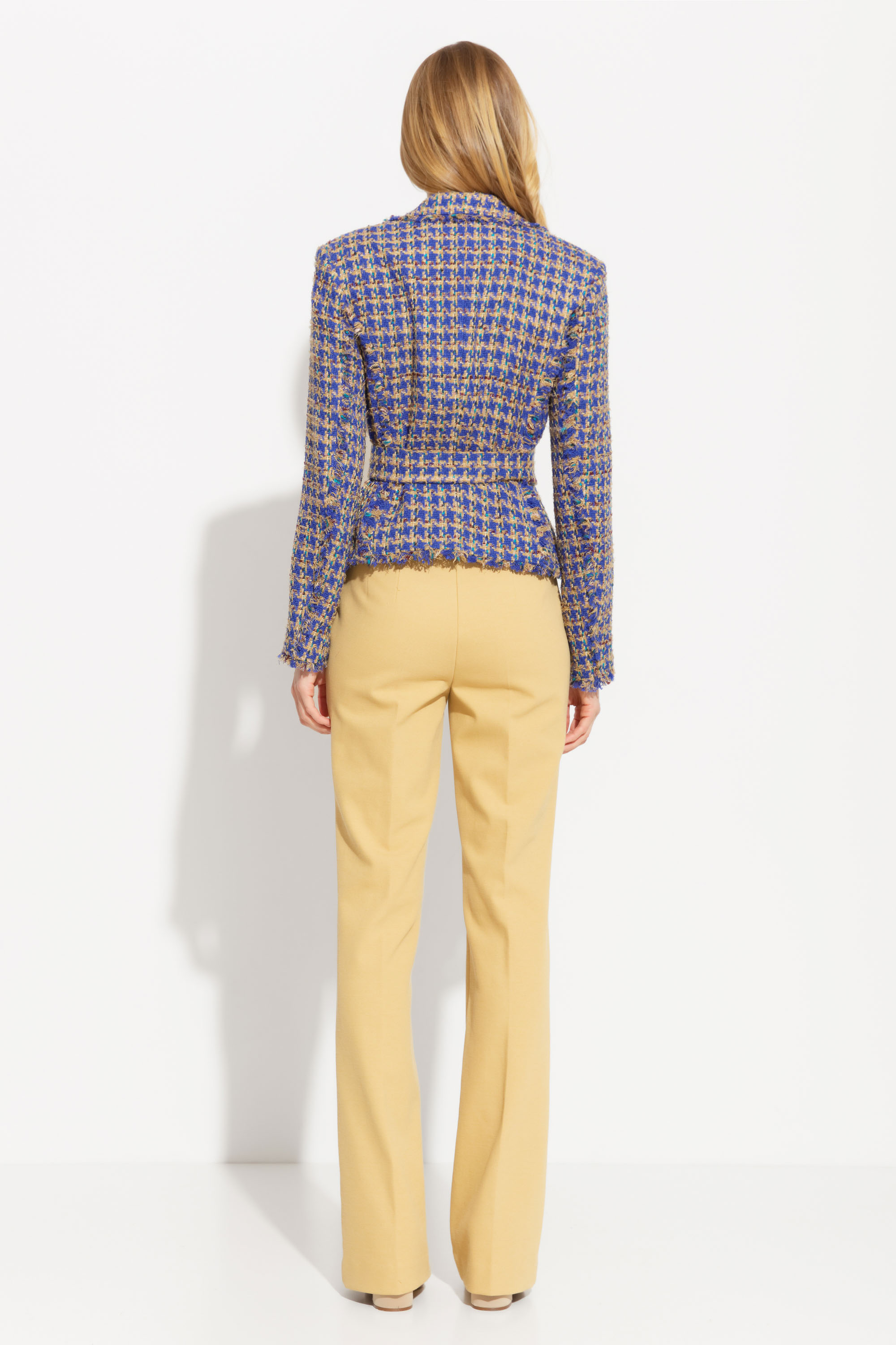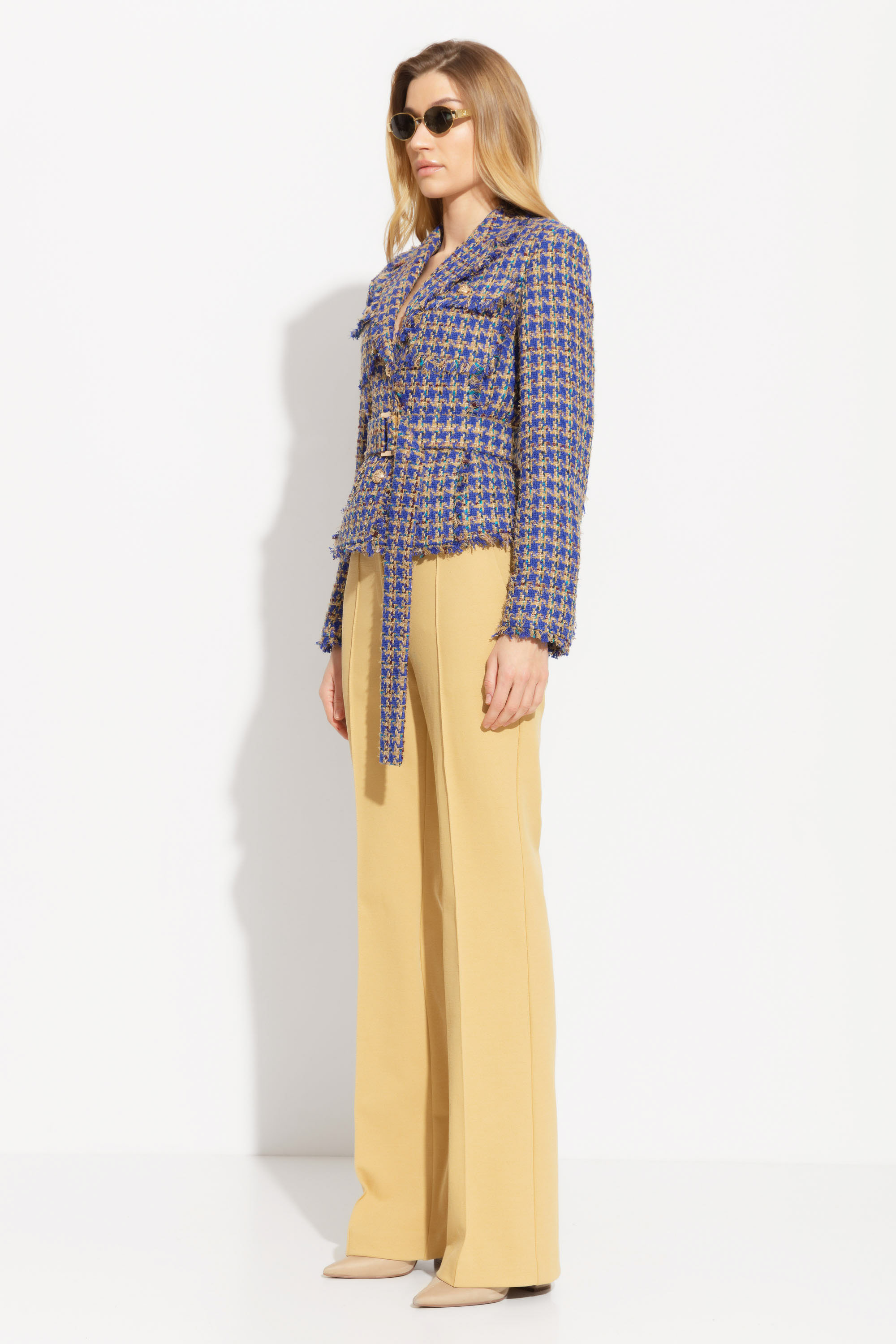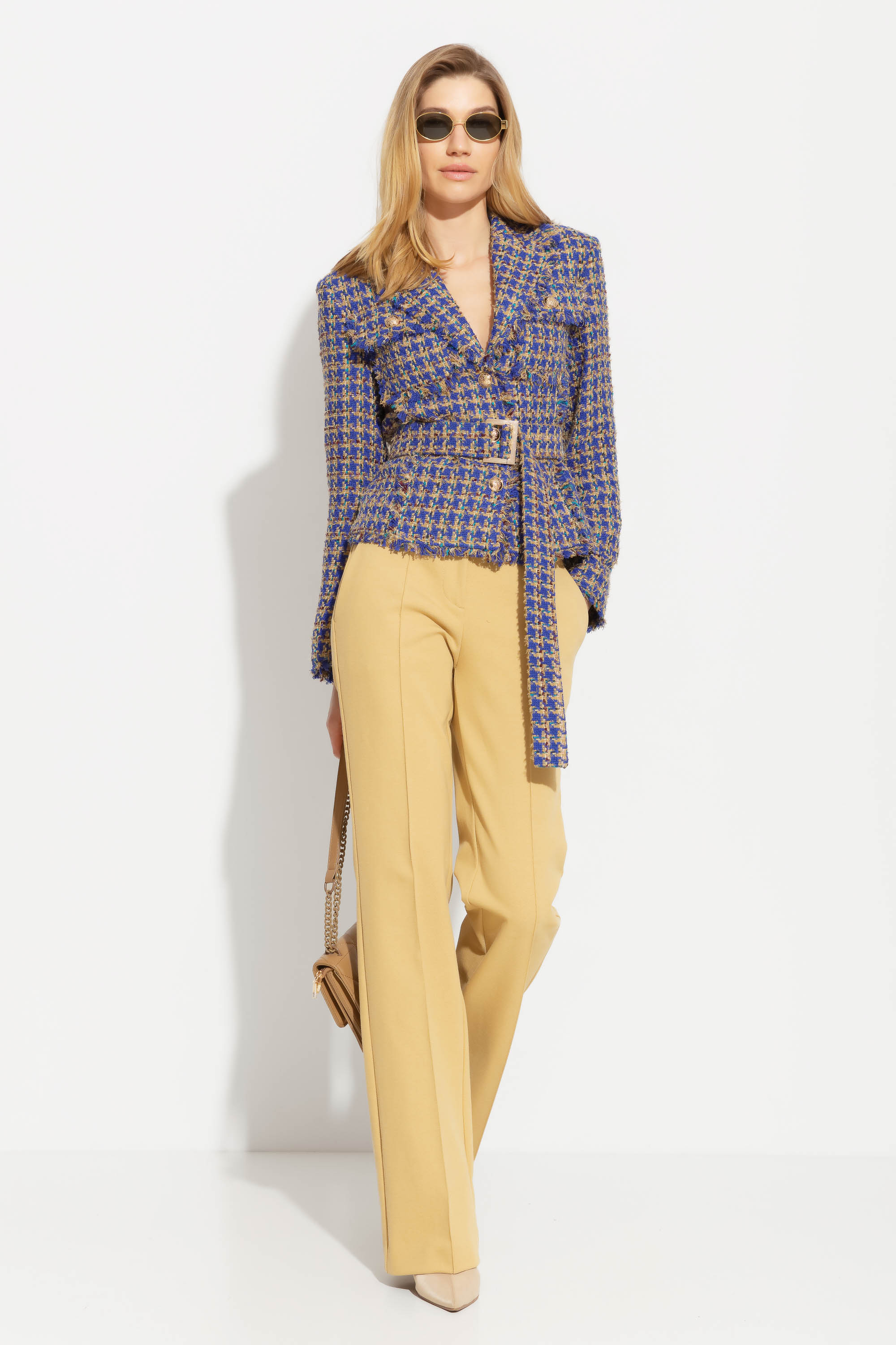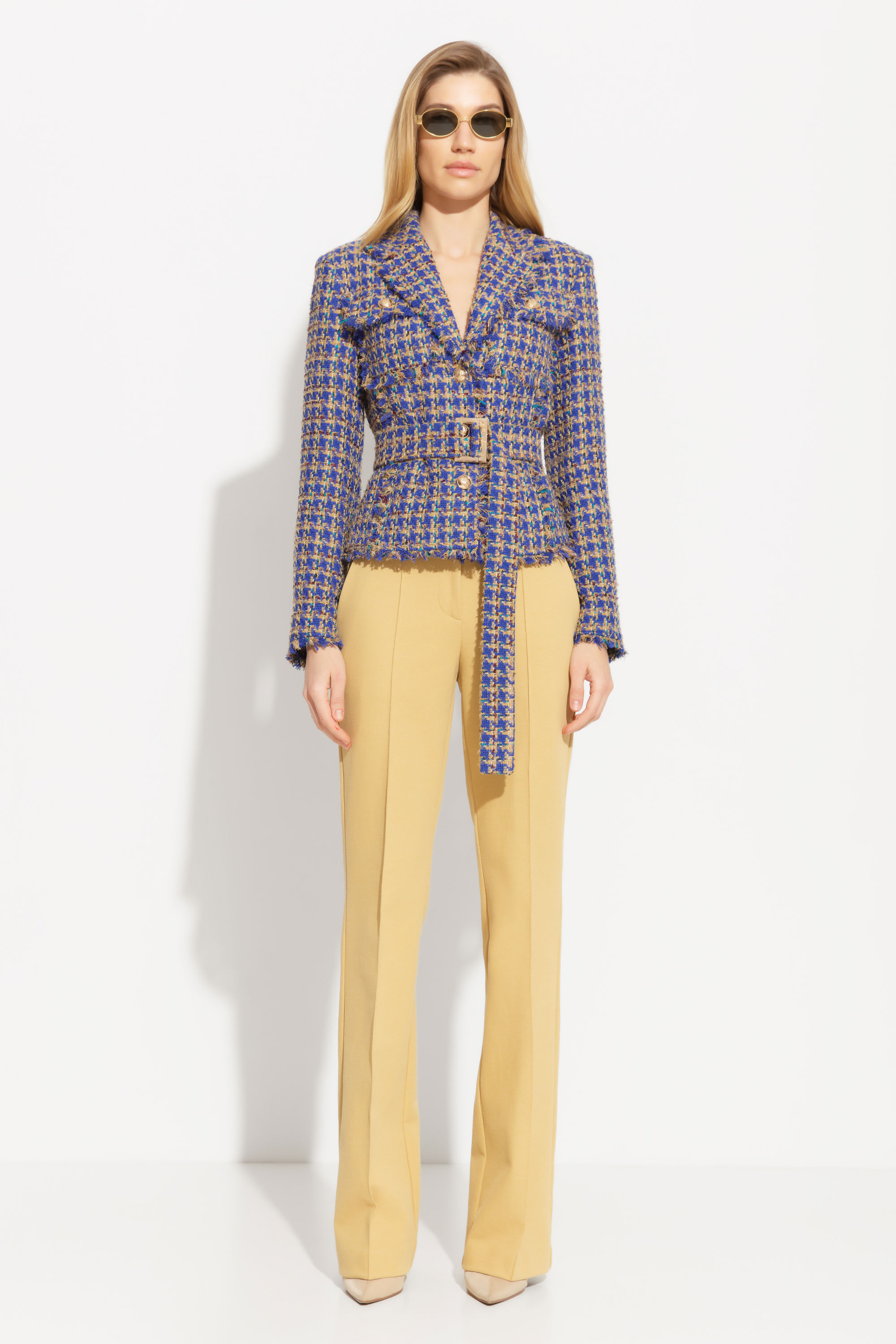 Жакет твидовый полуприлегающего силуэта, длиной до линии бедер. Центральный бортовый заход с застежкой на три сквозные петли и пуговицы придают жакету особую изысканность. Съемный пояс подчеркивает талию и добавляет женственности. Притачная подкладка и плечевые накладки обеспечивают комфорт и удобство при носке. Нагрудные выточки, рельефные швы, накладные карманы с клапанами - все эти детали делают жакет не только красивым, но и практичным. Рукава двухшовные, длинные, втачные, а воротник отложной с отворотом из подбортов добавляют жакету дополнительный шарм. Рельефные срезы и отделочные строчки по всем деталям делают этот жакет по-настоящему уникальным. Носите его на работе или на свидание - он гарантированно привлечет внимание и подчеркнет вашу красоту и стиль.
