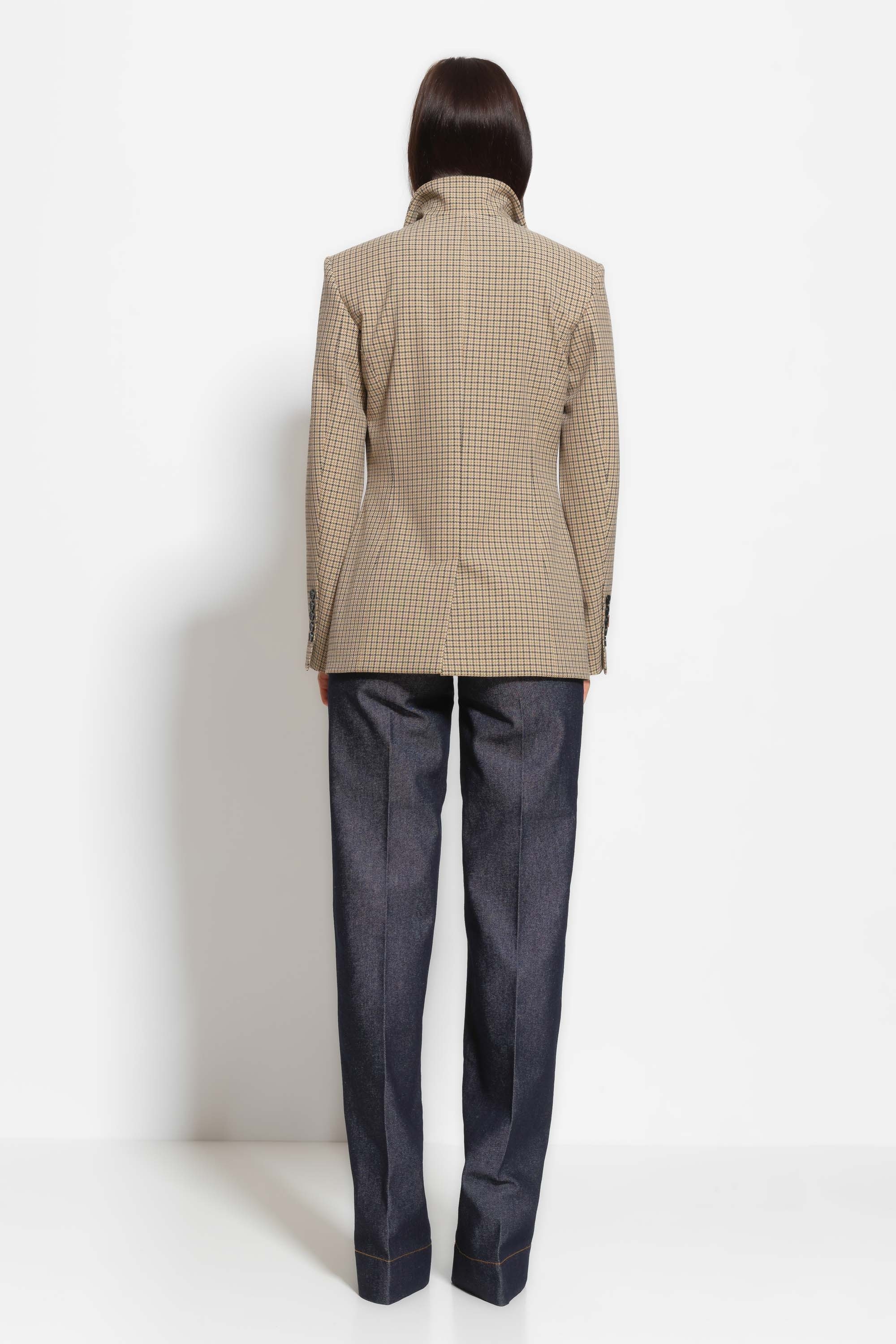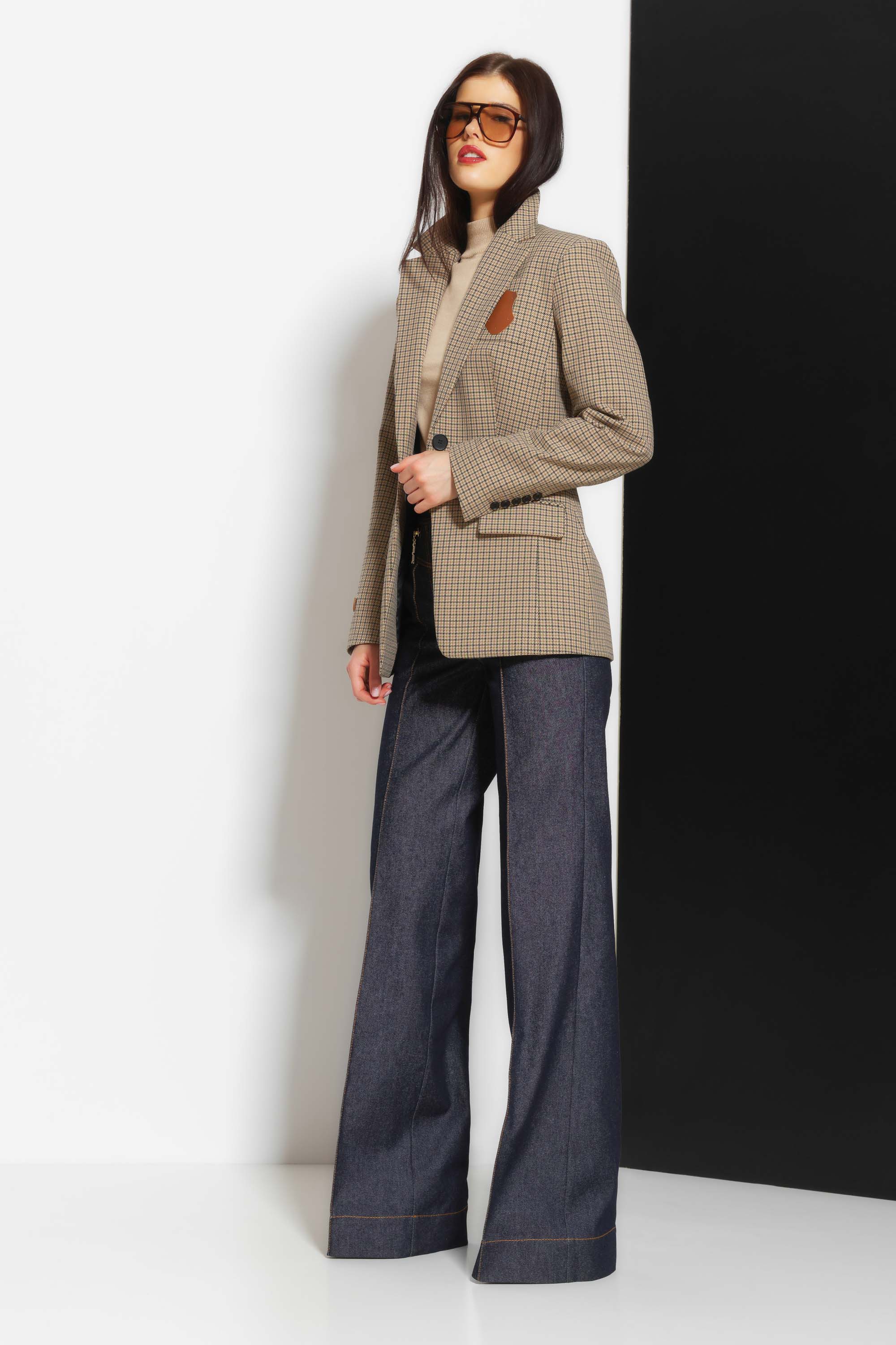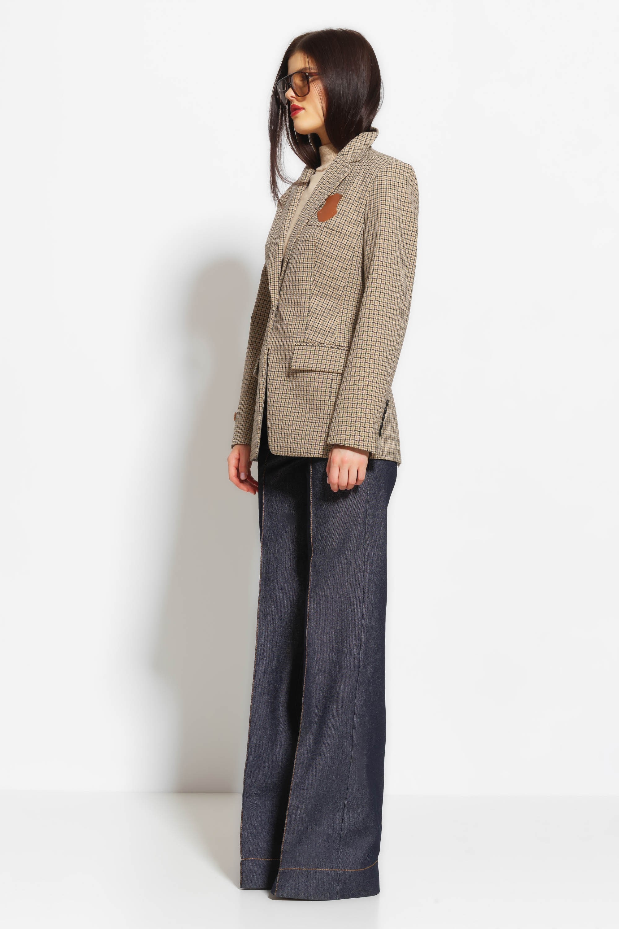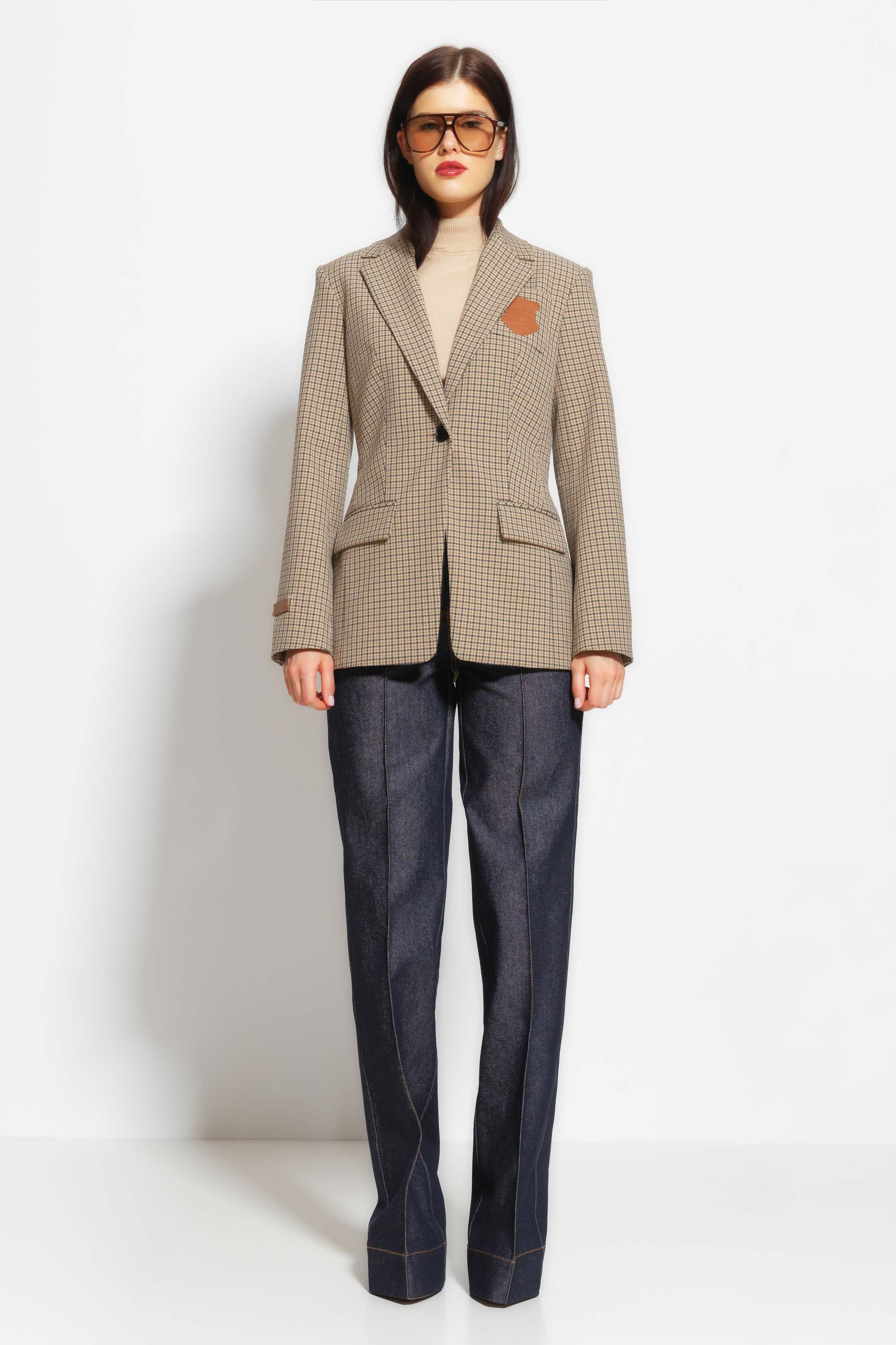 Жакет полуприлегающего силуэта, длиной ниже линии бедер. Воротник отложной. Передняя часть изделия и рукав декорированы нашивками. Спереди прорезные карманы с клапанами. Классическая расцветка в клетку добавляет образу свежести и расслабленности. Классическая, универсальная модель, которая подойдет к любому типу гардероба.
