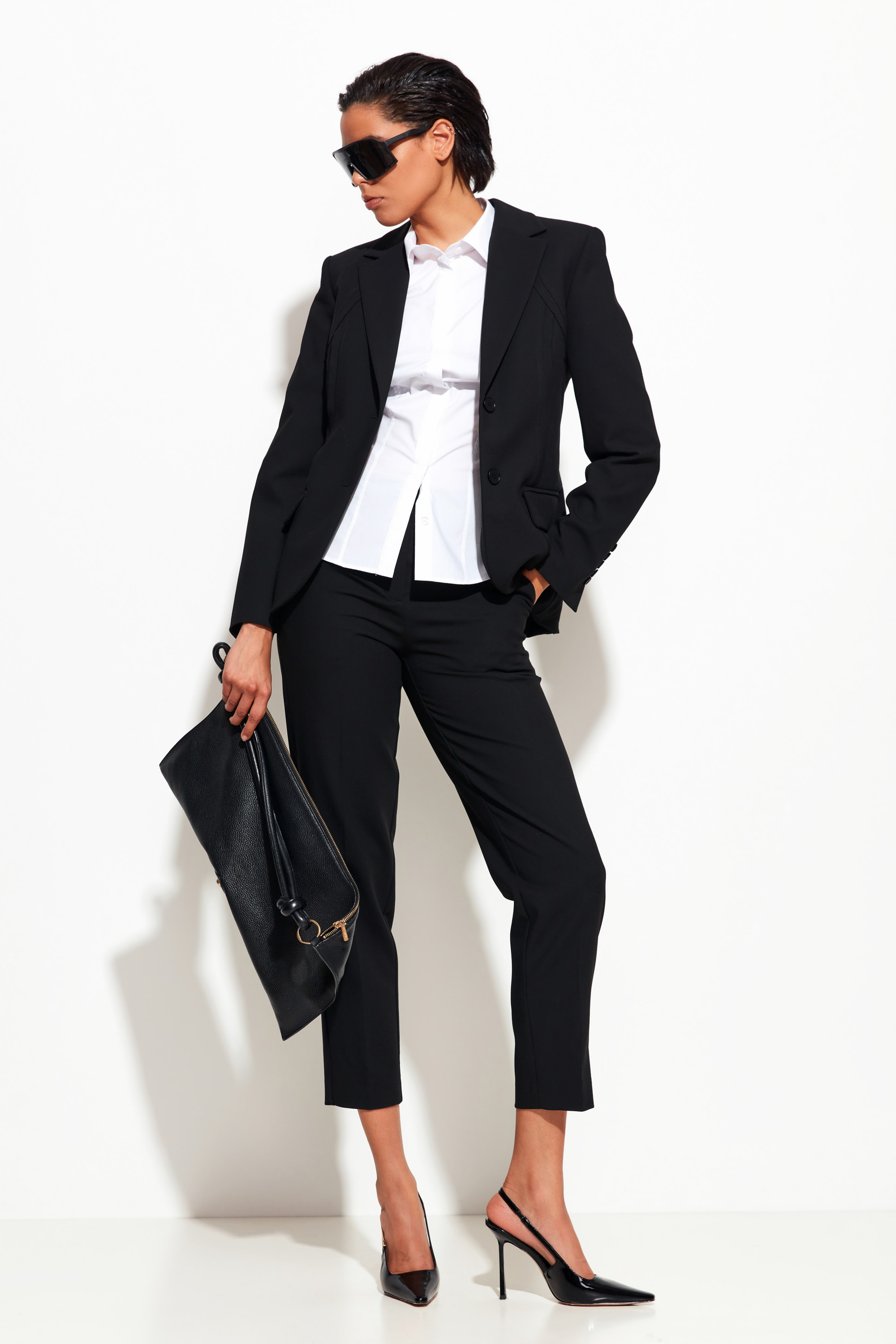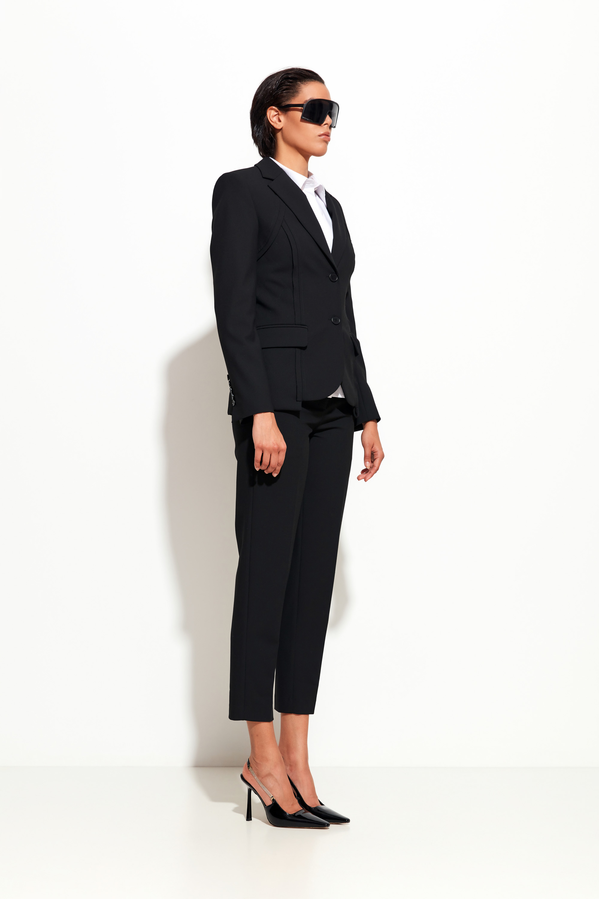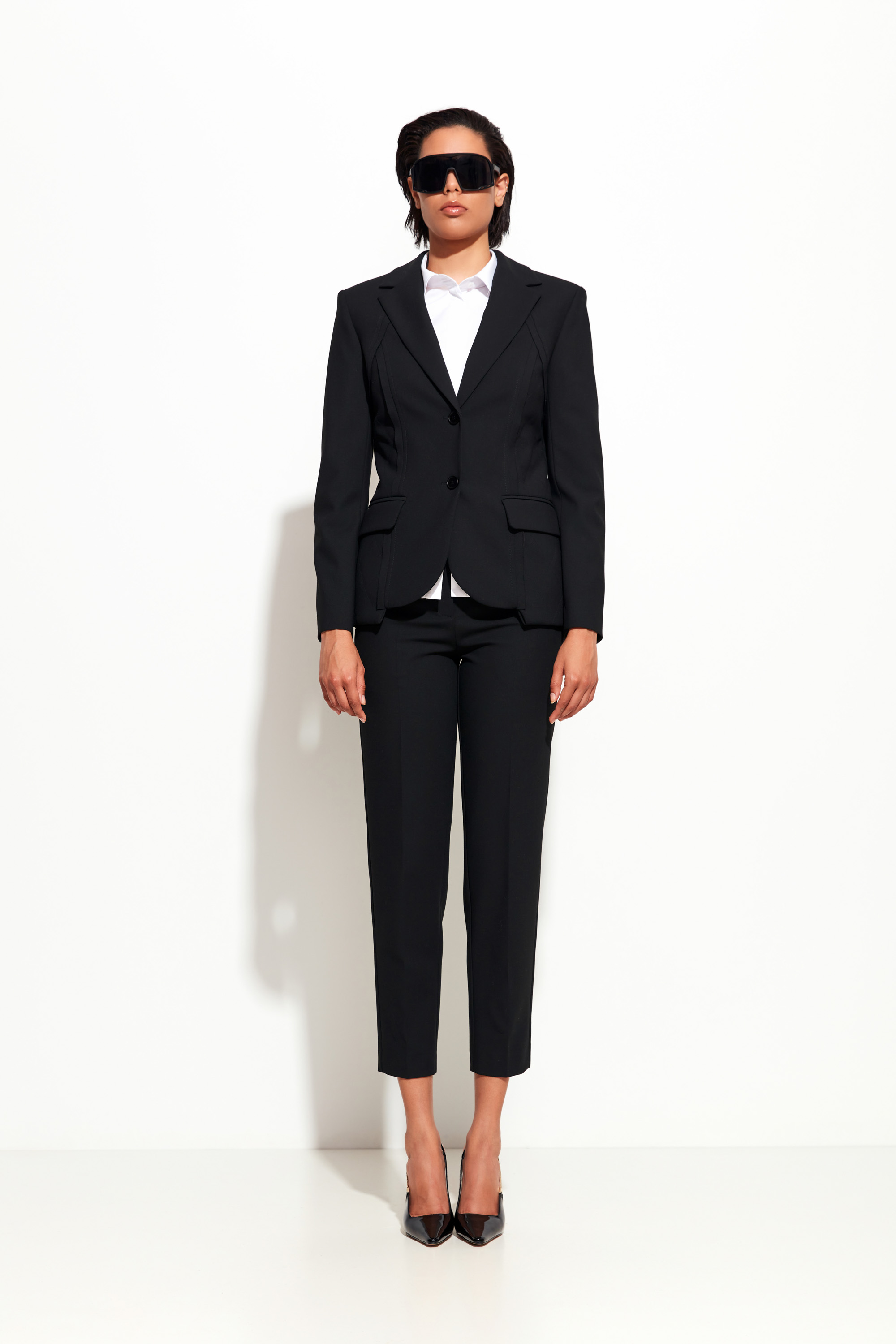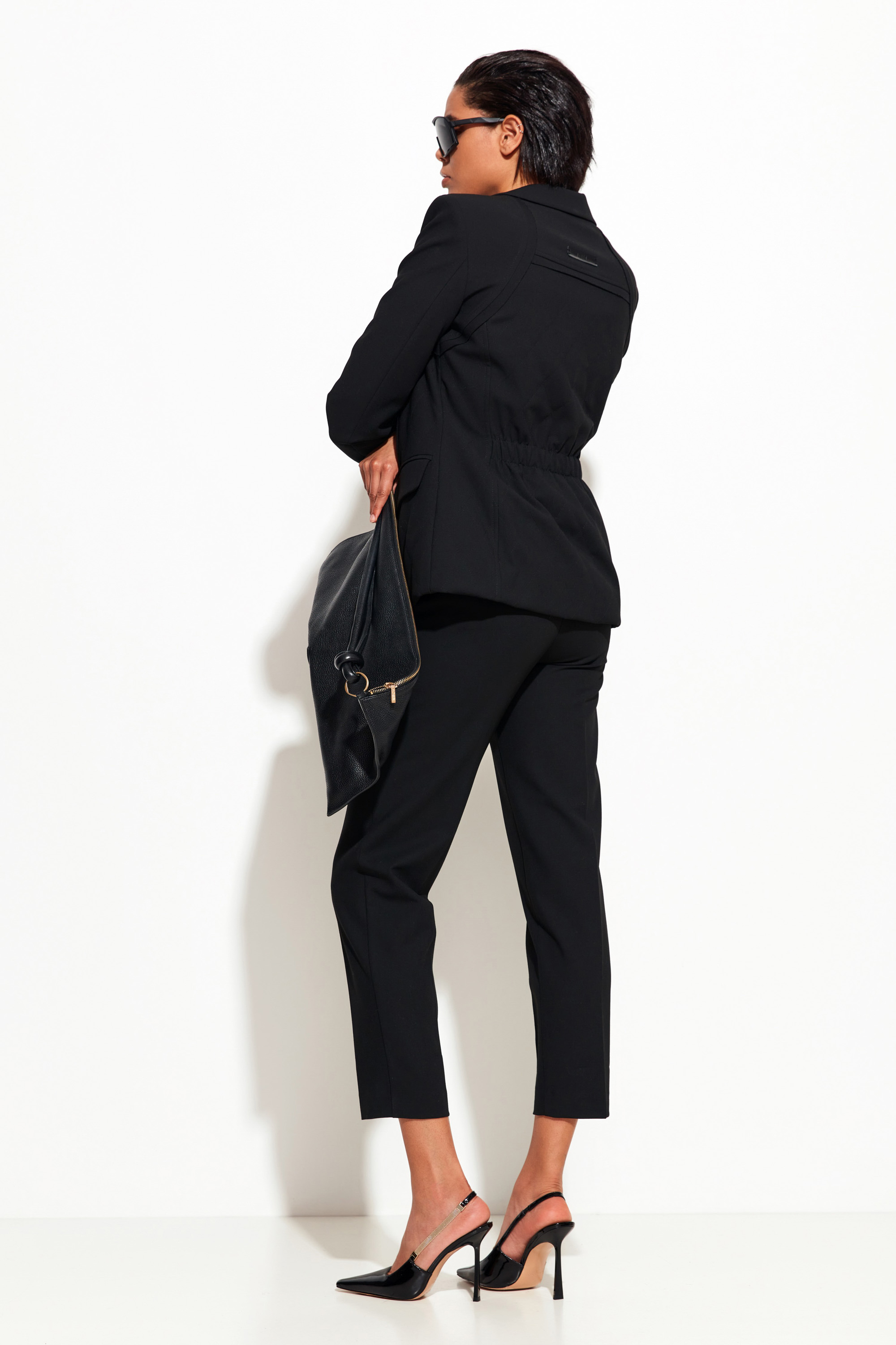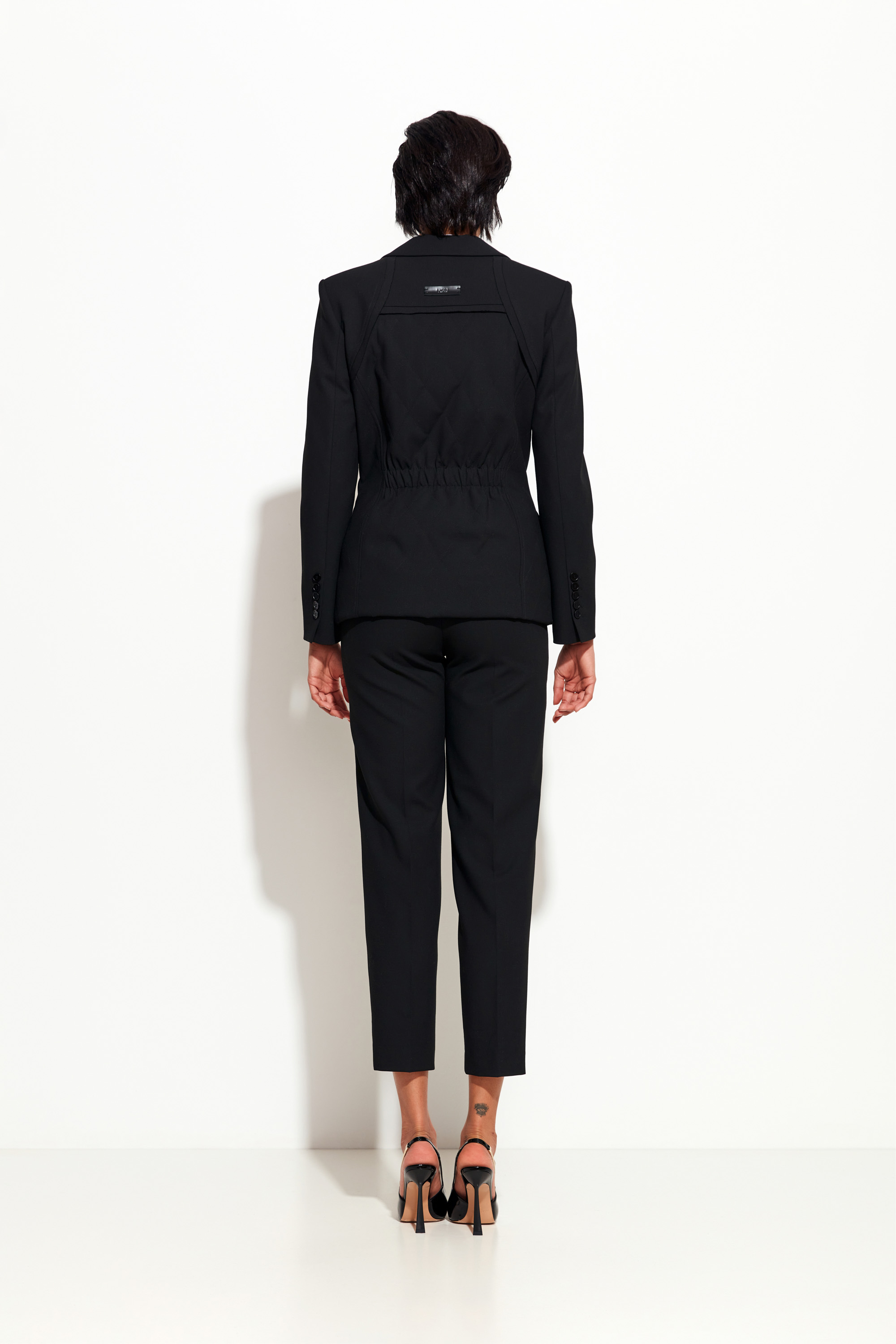 Черный приталенный жакет Lakbi из коллекции осень-зима 2025/26 — стильная модель, созданная для тех, кто ценит изящество и комфорт. Особенность жакета — потайная резинка на спине, которая мягко подчёркивает талию и придаёт образу женственность. Минималистичная нашивка на спине добавляет дизайнерский акцент, сохраняя сдержанность и элегантность.