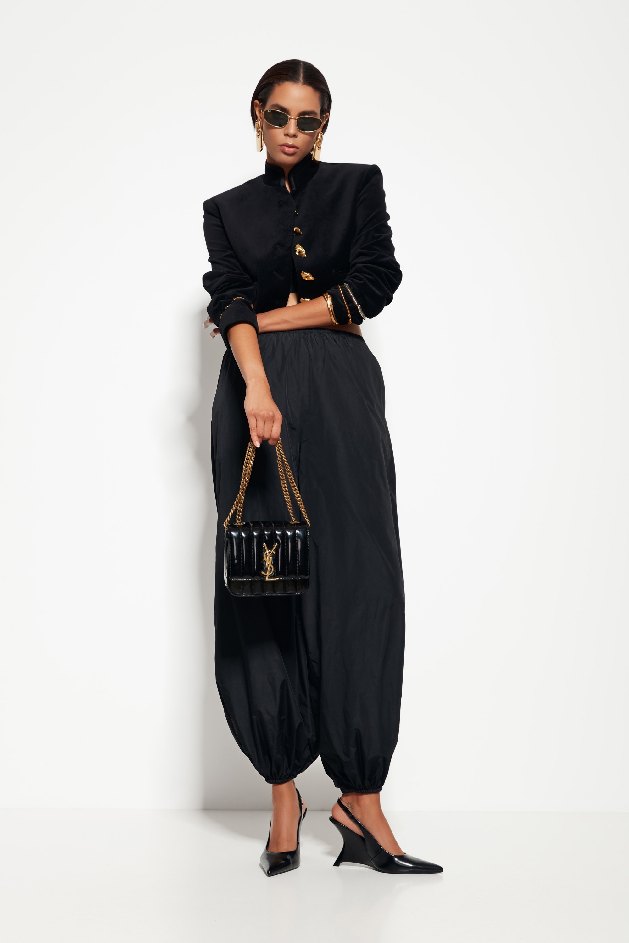 С аксессуарами, подчёркивающими блеск — сияющие серьги, блестящий клатч.