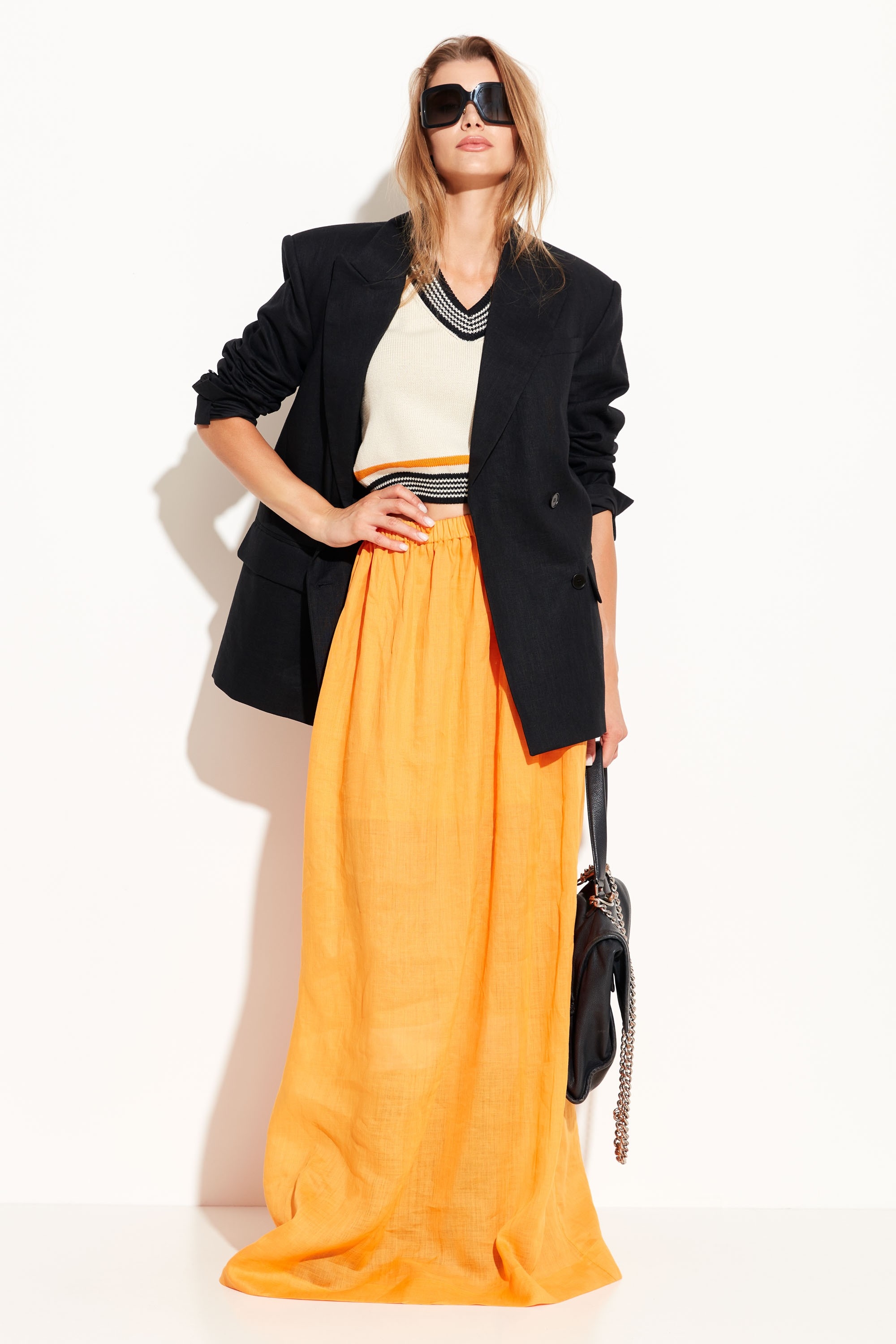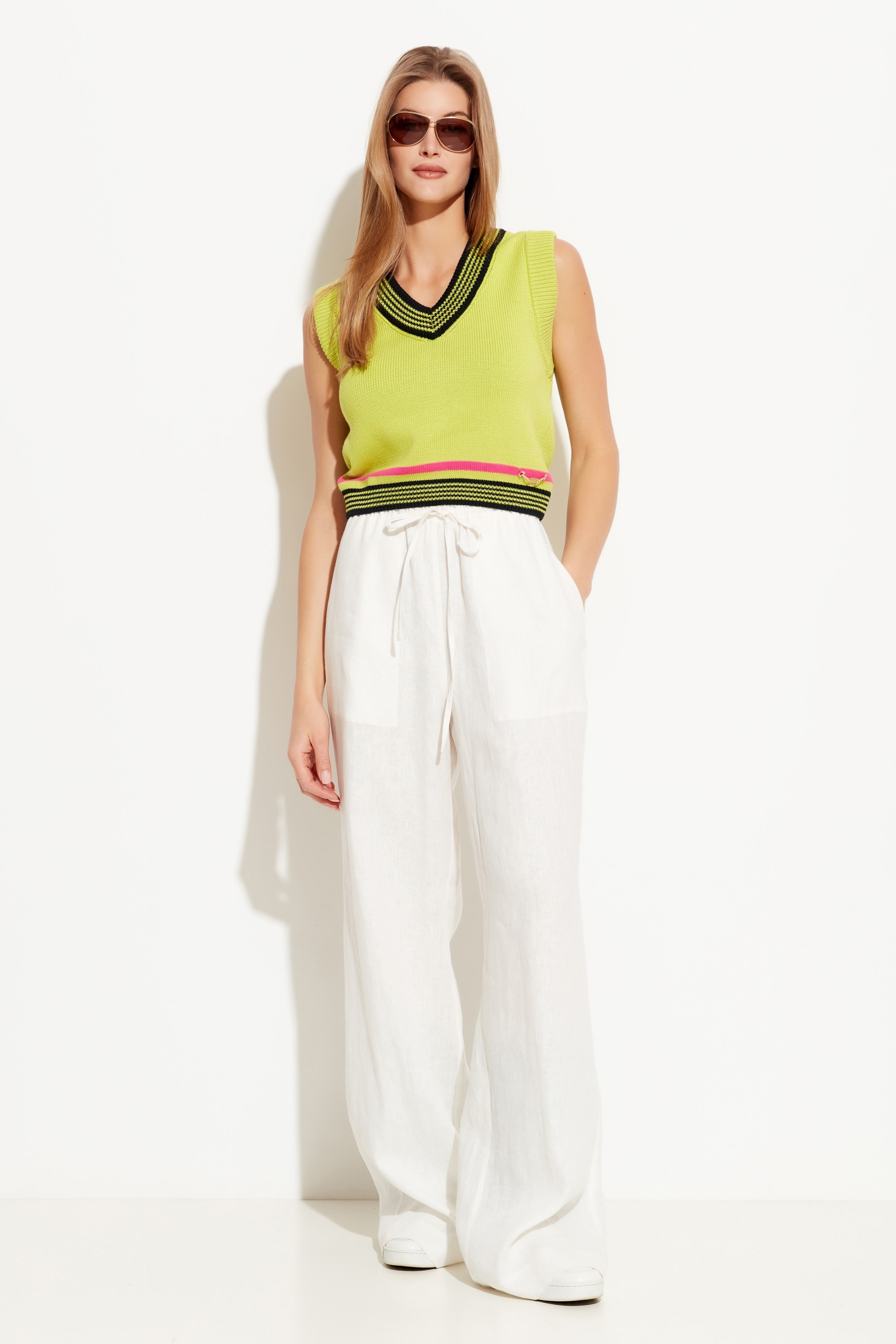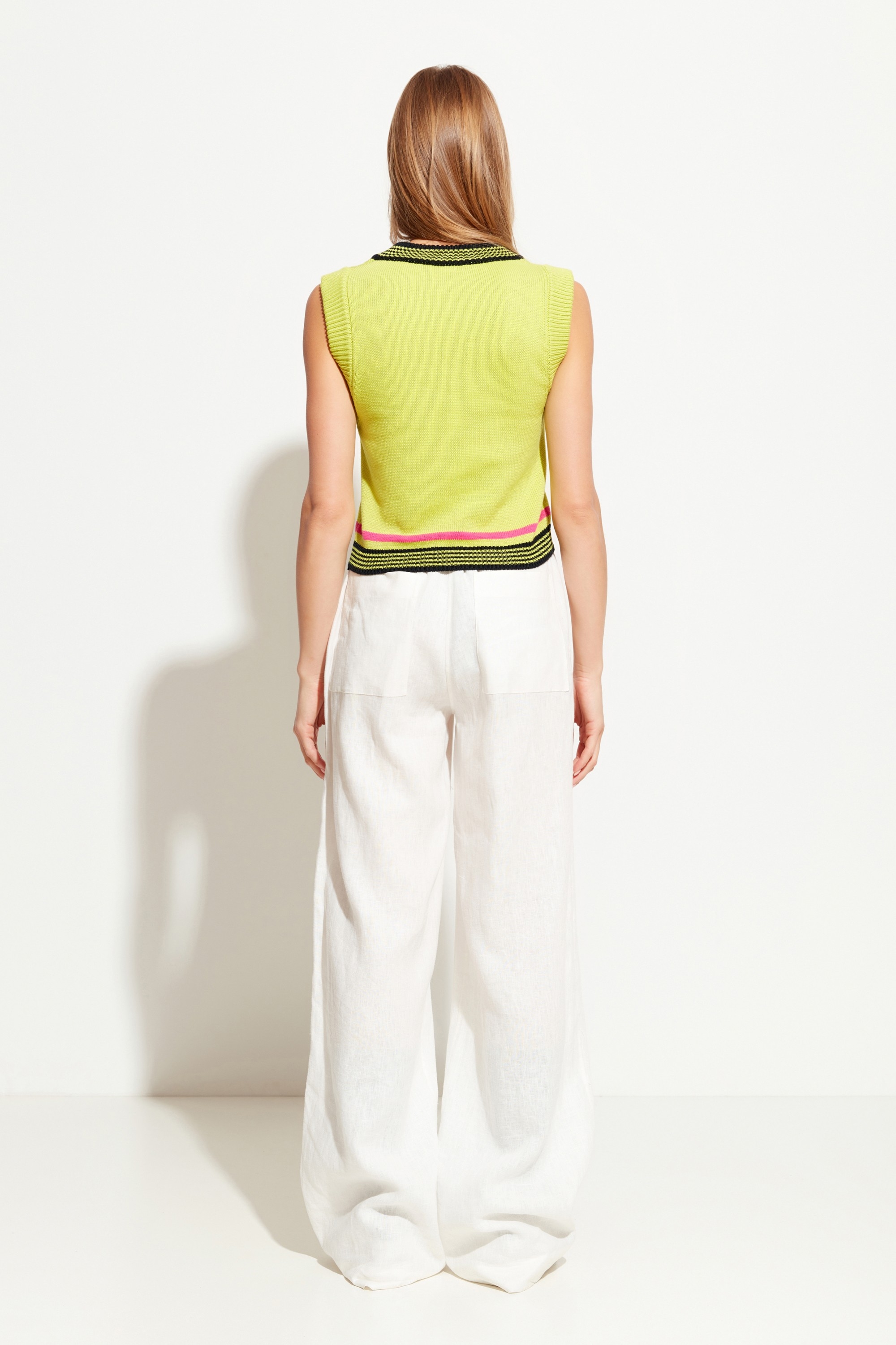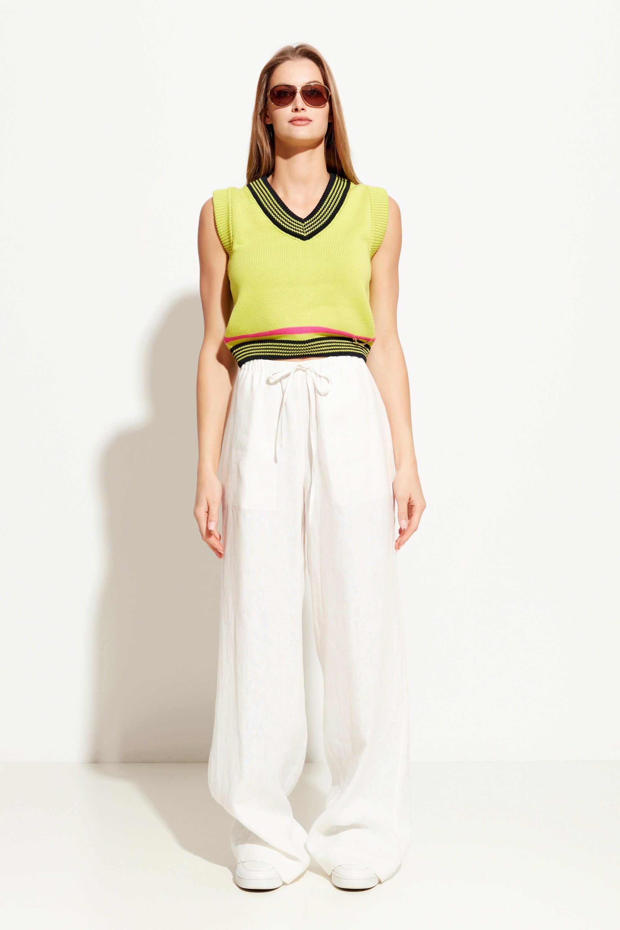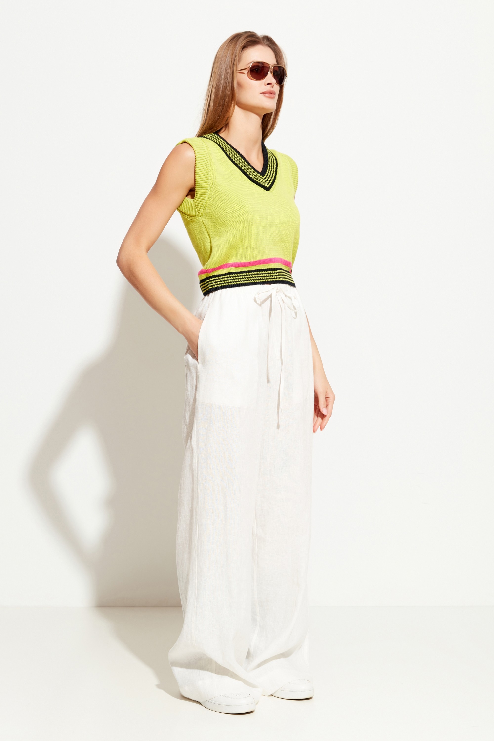 Жилет вязаный, укороченной длины. V-образный вырез горловины. Низ изделия на эластичной манжете. Свободный крой и дышащая ткань позволяют создавать с жилетом стильные весенне-летние образы по любому случаю.