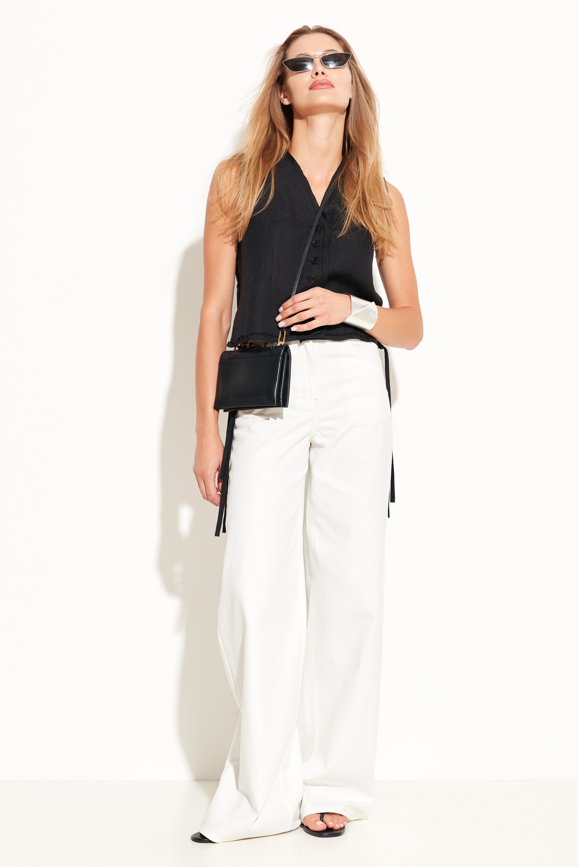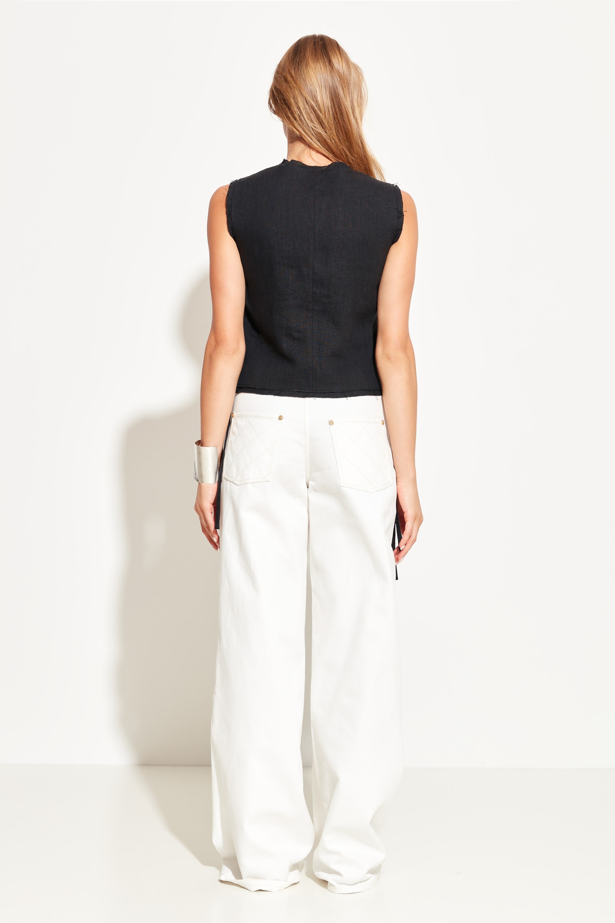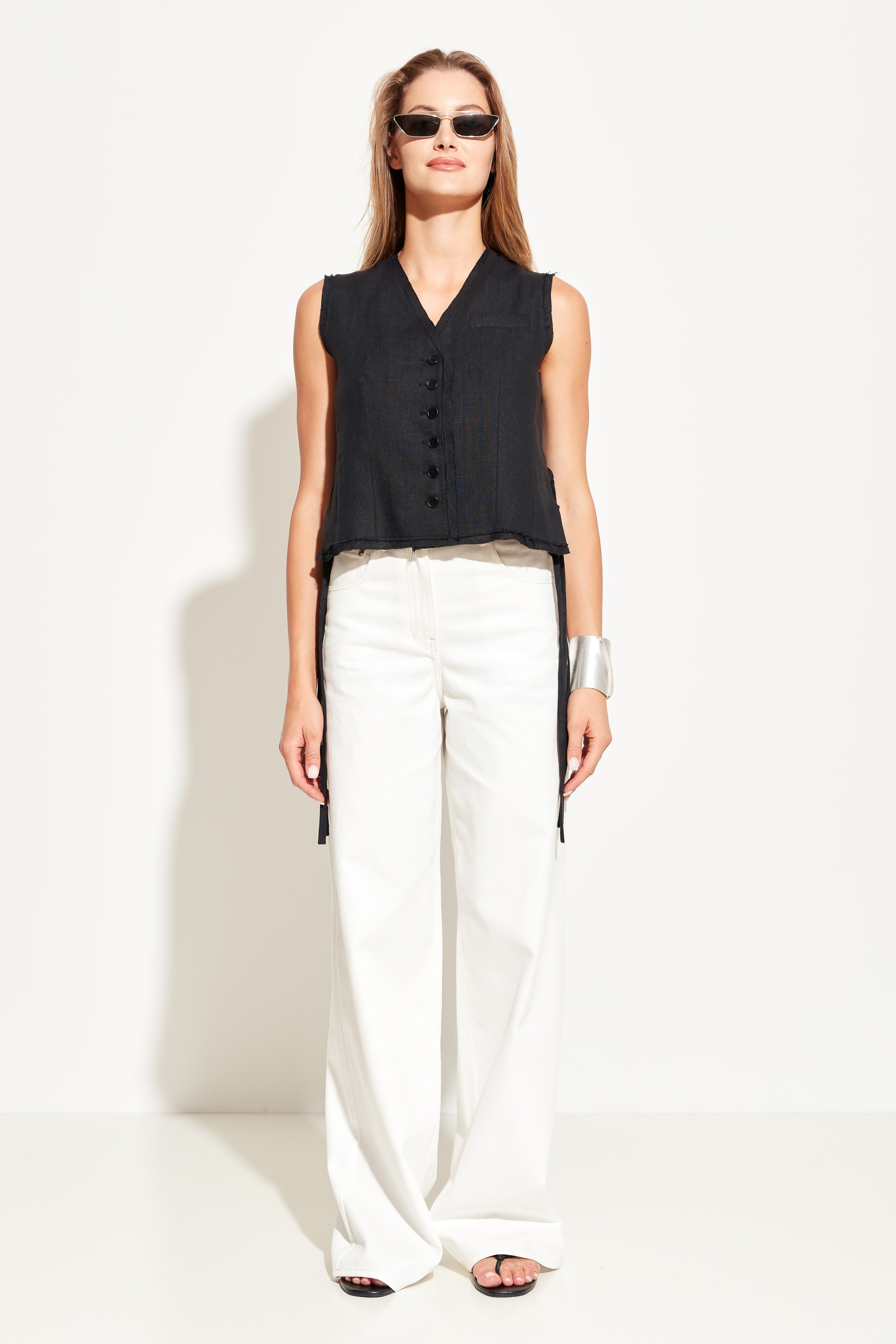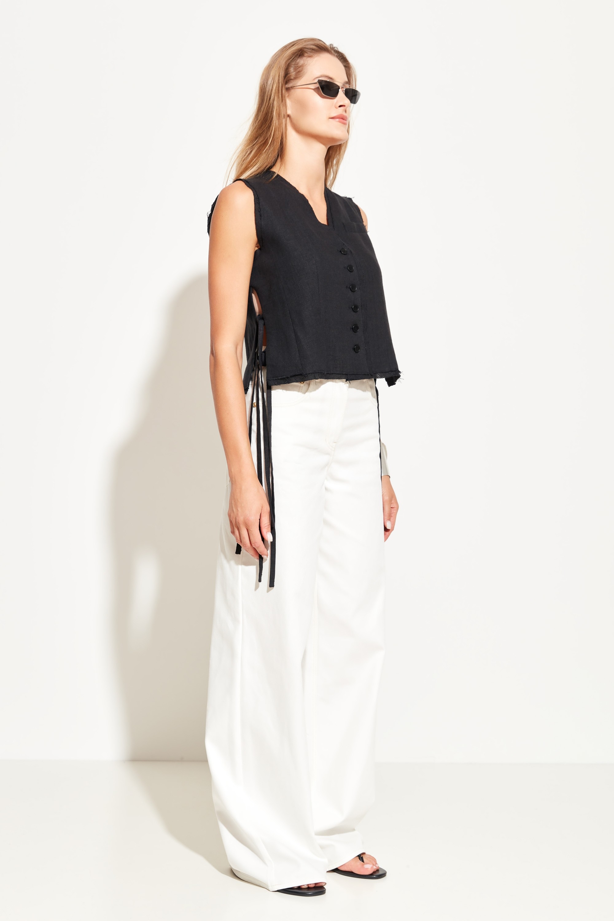 Жилет полуприлегающего силуэта, укороченной длины. V-образный вырез горловины. Края изделия не обработаны. По бокам завязки, которые добавляют образу расслабленности. Классическая модель для создания стильных городских аутфитов.