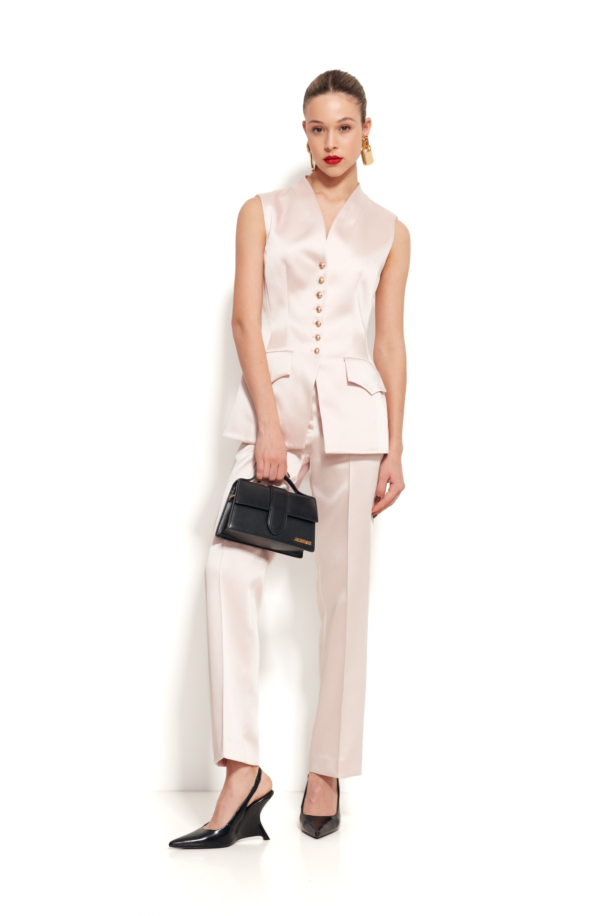 Модель из коллекции Party 2026 — жилет, сочетающий в себе строгий силуэт и яркие декоративные элементы. Его застёжка на золотые пуговицы привлекает внимание и придаёт образу изысканность. Приталенный крой подчёркивает талию, а вертикальные вытачки и карманы с клапанами добавляют структуру и стиль.