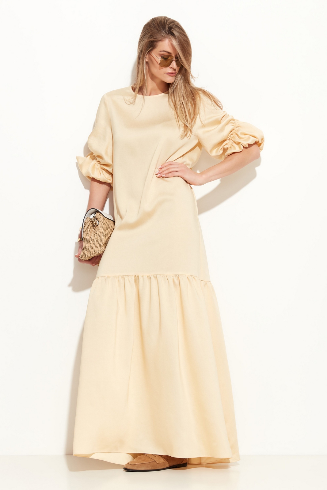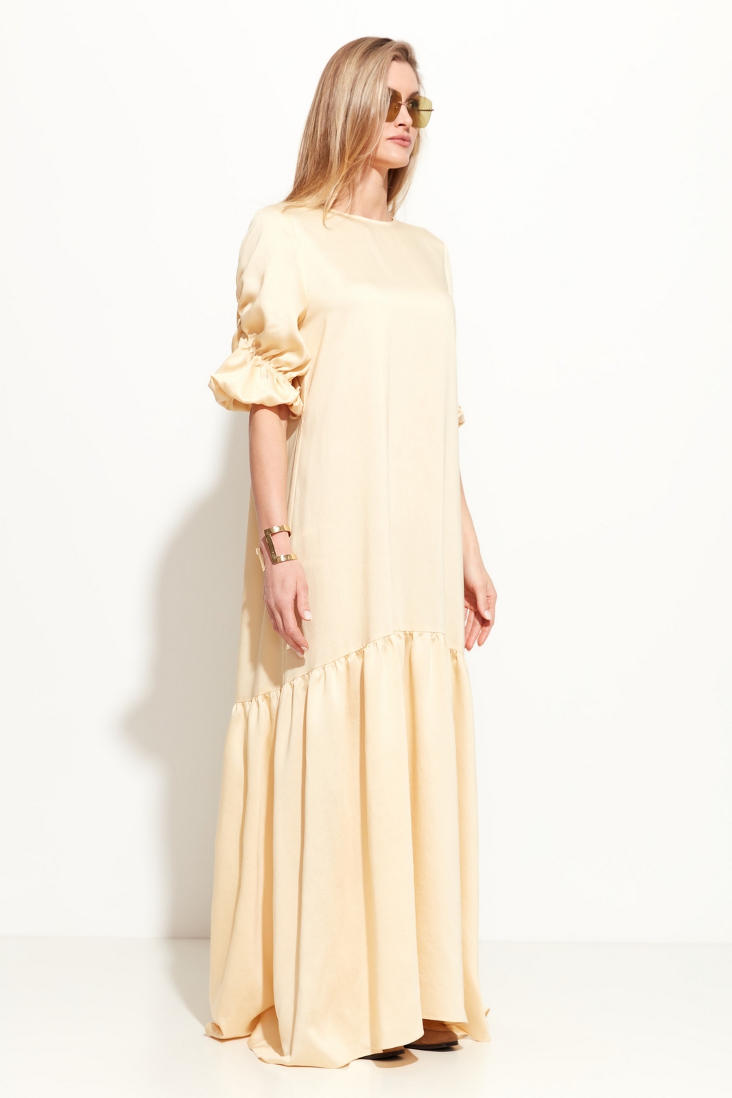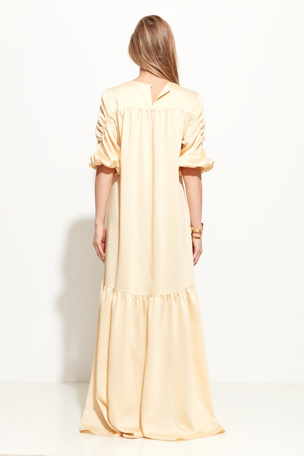 Платье свободного кроя в длине макси. Вырез горловины округлый. Линия плеч спущена. Спинка и рукава изделия декорированы драпировкой. Юбка в виде объемного волана добавляет образу легкости и расслабленности. Комфортная модель для жарких летних дней.