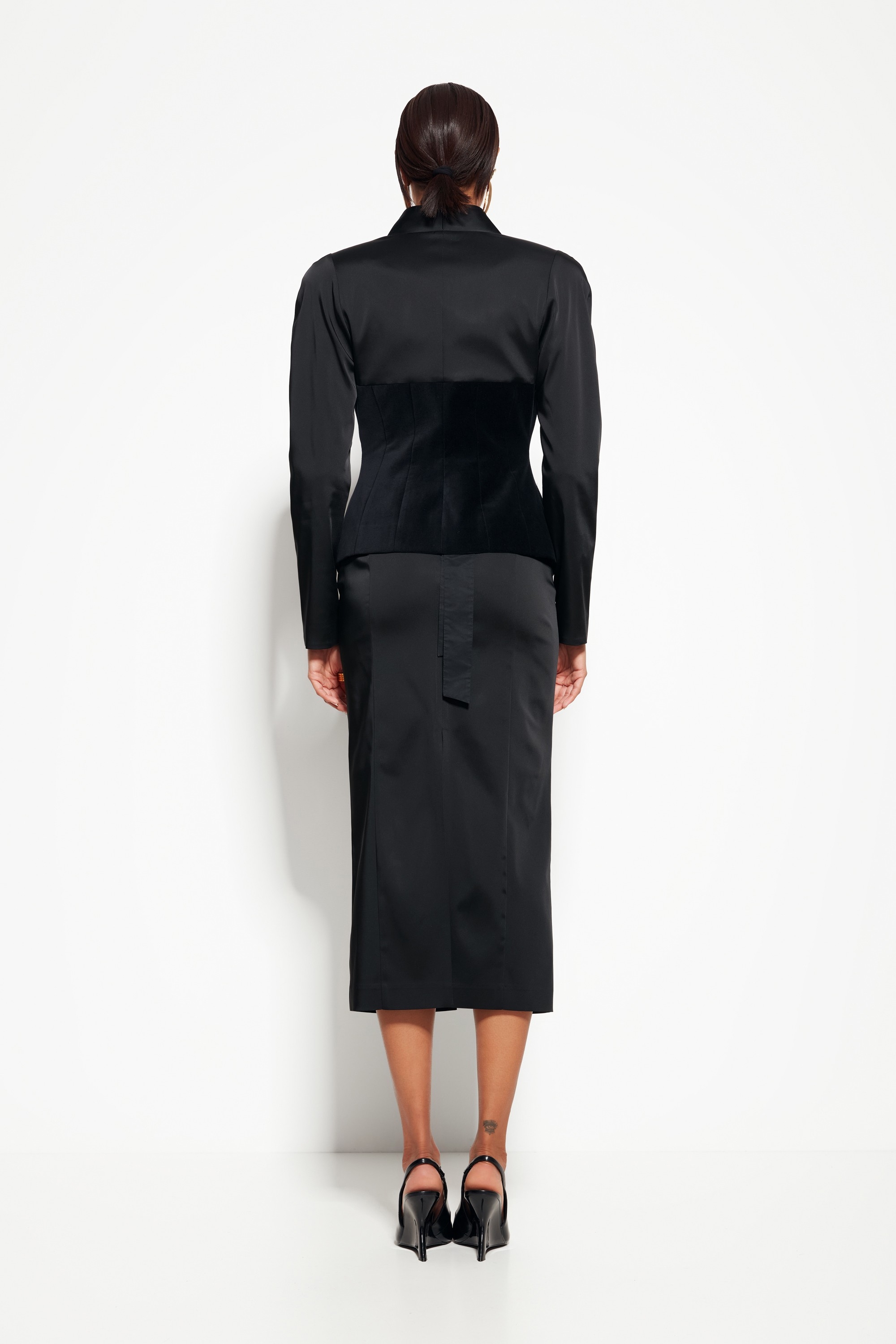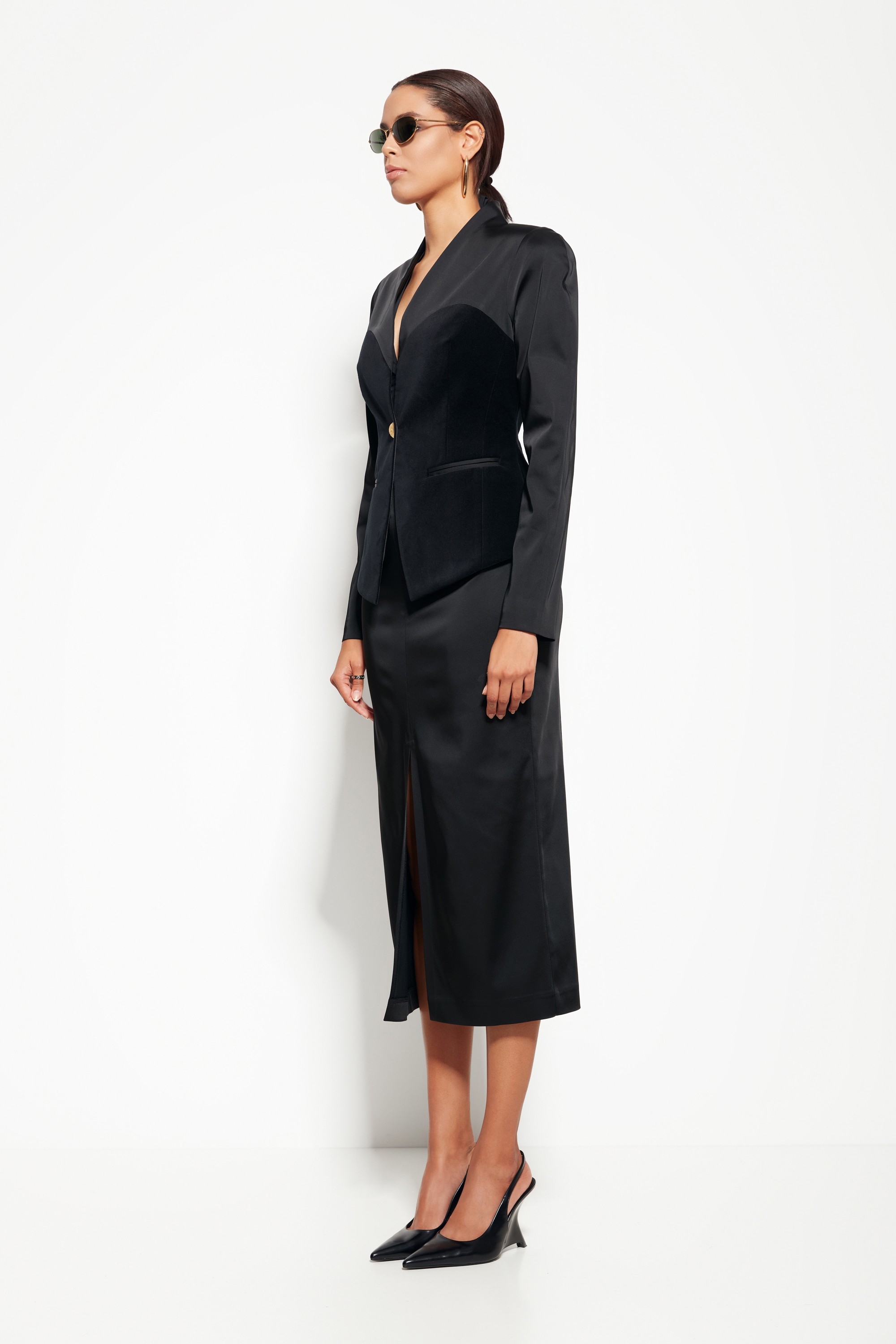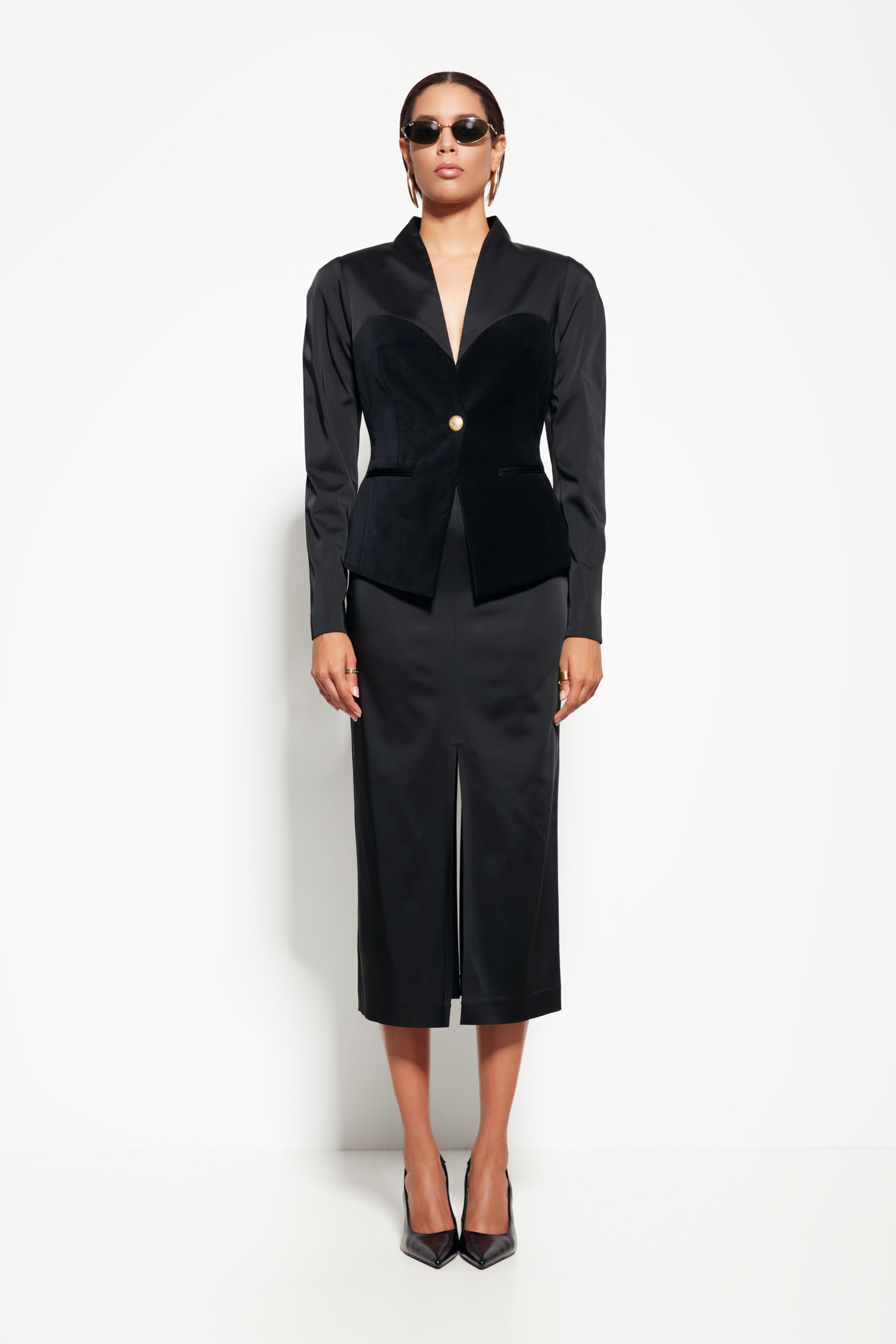 Модель из коллекции Party 2026 — жакет с эффектной бархатной вставкой, создающий выразительный и современный образ.
