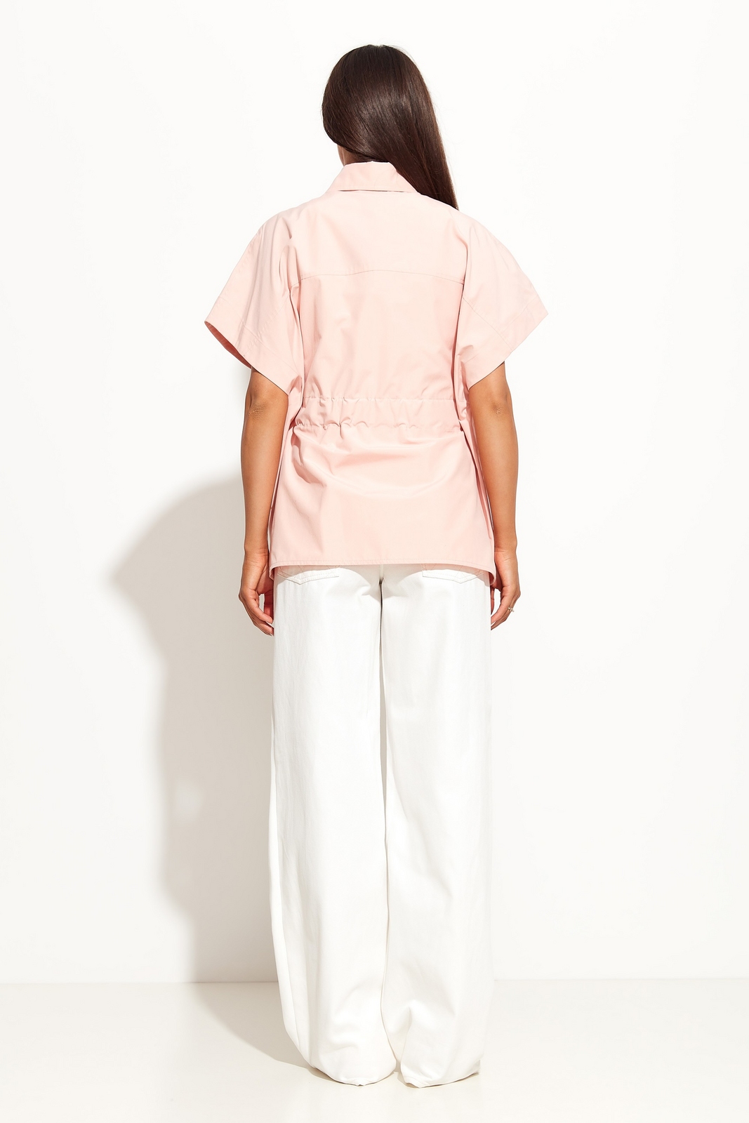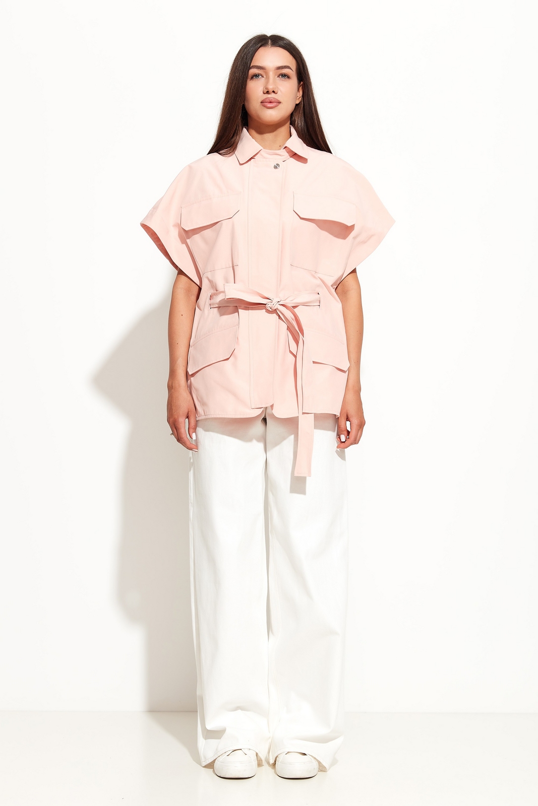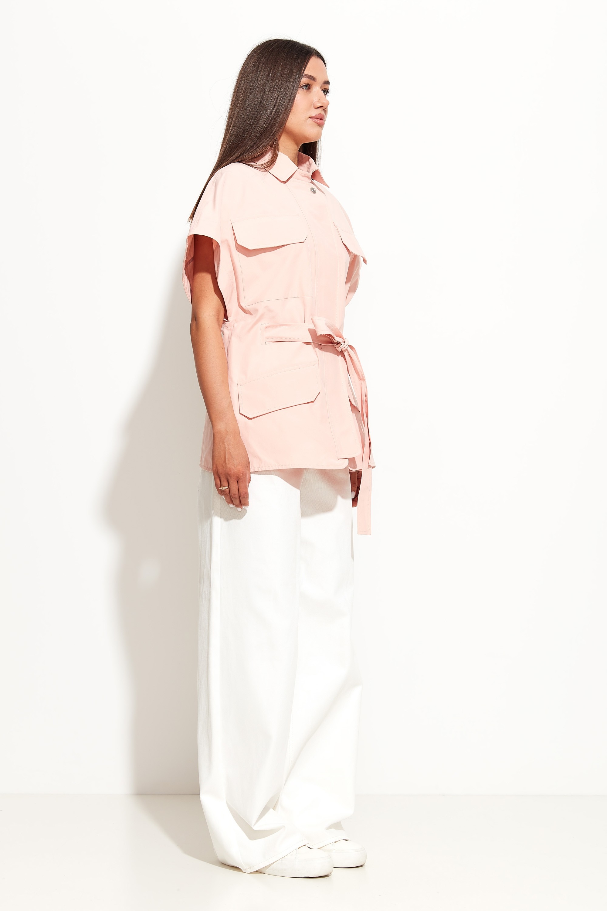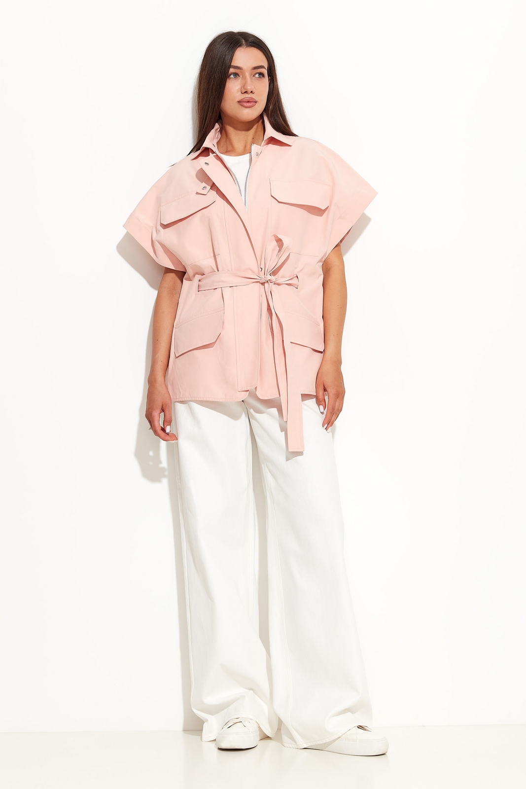 Жилет прямого кроя, длиной ниже линии бедер. Воротник стояче-отложной. Линия плеч спущена. Объем талии регулируется при помощи пояса из аналогичной ткани. Стильная модель, которая идеально подойдет для создания трендовых летних образов.
